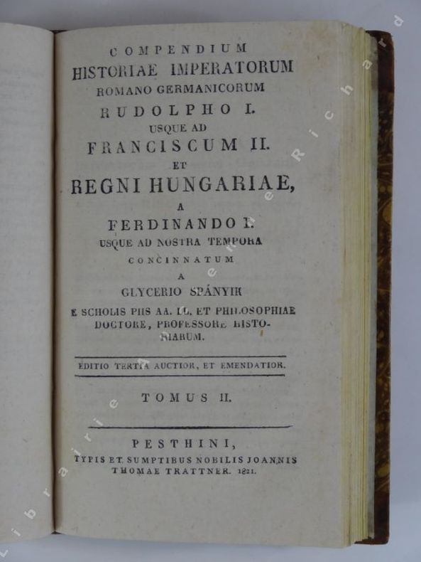 Pesthini, Trattner, 1821, 2 tomes en 1 volume in-12 (11 x 18.5 cm.), 166 pp. et 164 pp., demi-basane à coins, d'époque, dos lisse muet orné de fleurons à froid, une tache de brûlure sur le premier plat sinon bon exemplaire.