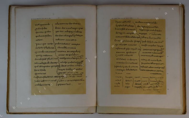 Berlin, Königliche Akademie der Wissenschaften, 1848. In-4 (286 x 225 mm), (2) ff., 87 pp., 5 pl. avec 9 fac-similé, reliure cartonnée muette, coiffes choquées, manques (25 et 15 mm) en tête et pied du dos, coins ouverts, couvertures et dos avec traces d'usage, bordure sup. des ff. brunie, rares piqûres de rousseurs, exemplaire à grandes marges, charnière relâchée pour les premiers feuillets, texte en allemand, caractère romains, bel état intérieur.
