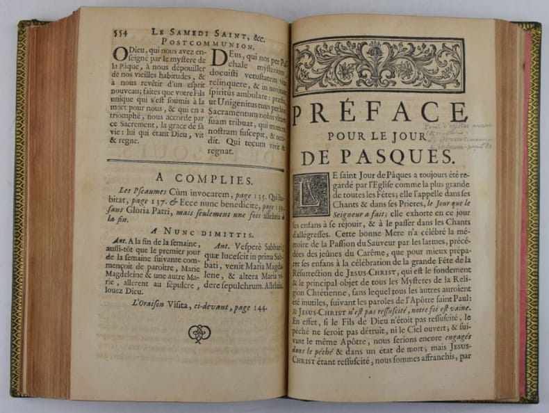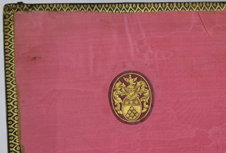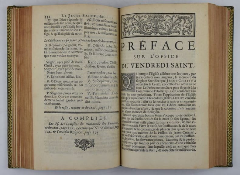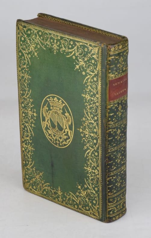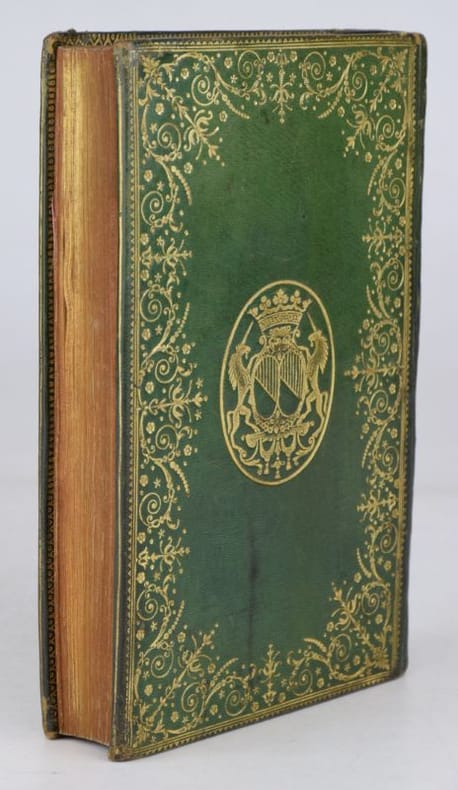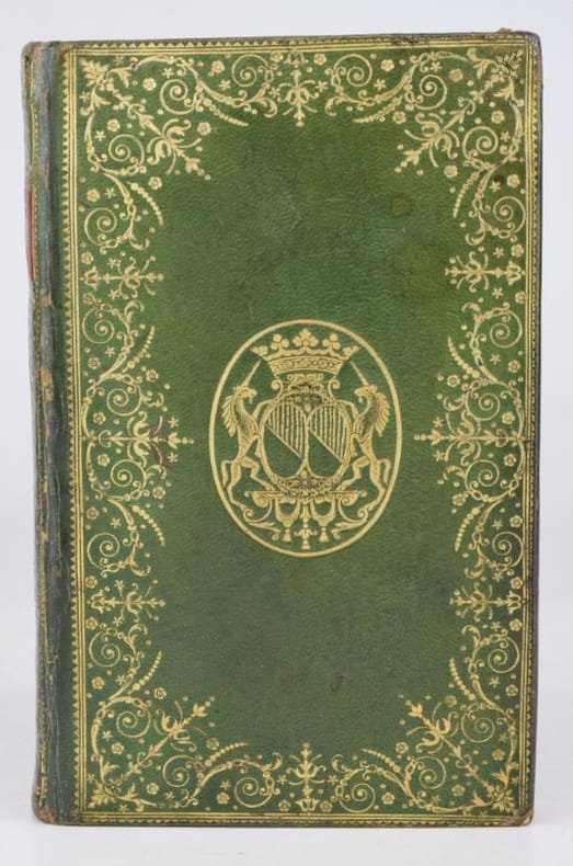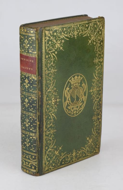 Superbe reliure en maroquin vert "à la dentelle" aux armes d'Émilie de Gaufridy, fille du baron de Fos et épouse de Joseph-Jacques de Gaufridy, seigneur de Saint-Estève et d'Auriac. Ces deux familles de la noblesse provençale, distinctes, quoiqu'alliées par ce mariage, célébré à Aix-en-Provence en 1767, portaient les mêmes armoiries, accolées sur la présente reliure. Un ex-libris armorié non identifié sur le contreplat.Les armoiries sont réalisées à l'aide d'une plaque neutre complétée aux petits fers.