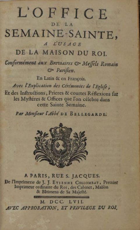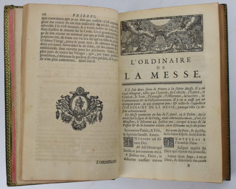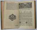 Paris, J. J. Etienne Collombat, 1757. In-8, 688 pp., illustrée de bandeaux et culs-de-lampe gravés sur bois. Reliure en maroquin vert, dos lisse orné d'un fer d'entre nerfs et de palettes dorés, pièce de titre rouge, plats ornés d'un décor à la dentelle doré aux petits fers, armoiries au centre, roulette intérieure, gardes de tabis rose, tranches dorées (Reliure de l'époque). Minimes frottements aux mors et aux coins.