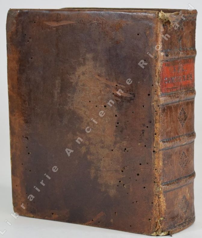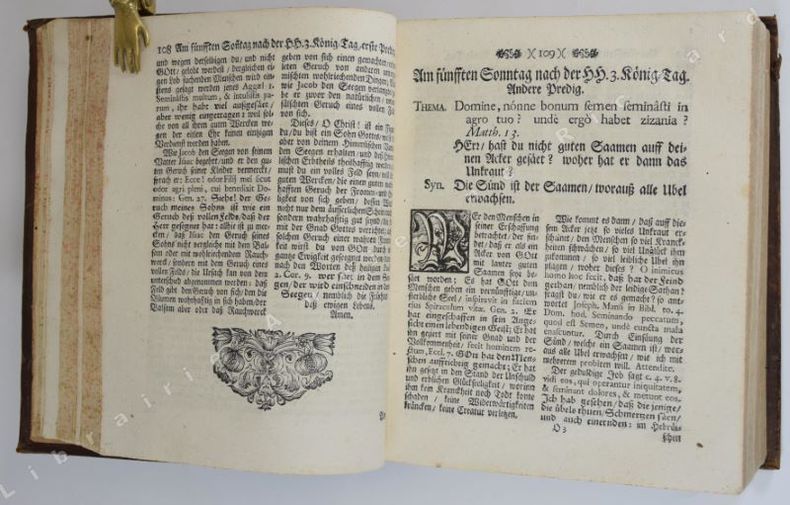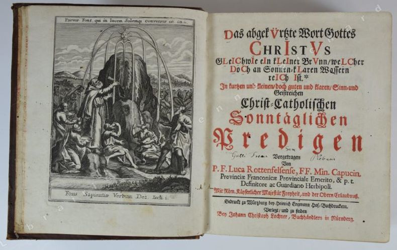 Würzburg, Heinrich Engmann Hof-Buchdruckern, verlegt und zu finden Bei Johann Christoph Lochner, Buchhändlern in Nürnberg, 1722. In-4 (204 x 165 mm.), frontispice gravé, page de titre, (3) ff. dédicace/ Widmung, (2) ff. Approbatio Theologica, (1) f. Privilegium Caesareum, 479 pp., (6) ff. Register/Verzeichnis. Suivi de : "Das abgekürzte Wort Gottes/Christus... Christ-Catholischen feyertäglichen Predigen..." 443 pp., (13) pp. "Ein Auszug und Zeiger aller vornehmen Sachen" (Register), 2 bandeaux, lettrines, impression en 2 colonnes. Reliure veau, dos à nerfs, étiquette de titre rouge, coiffes endommagées, coins choqués, tranches inf. frottés, 1 coin ouvert, deuxième plat : épidermures et cuir rapé, rousseurs sur tranches, très nombreux trous de vers dans plats et premiers feuillets, 1 à 2 trous de vers dans la première et dernière partie des feuillets, la moitié des feuillets sans aucun trou.