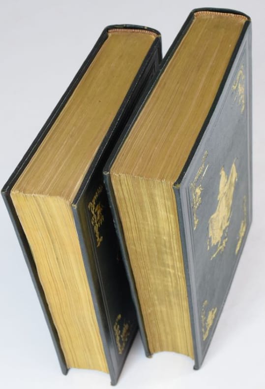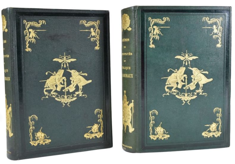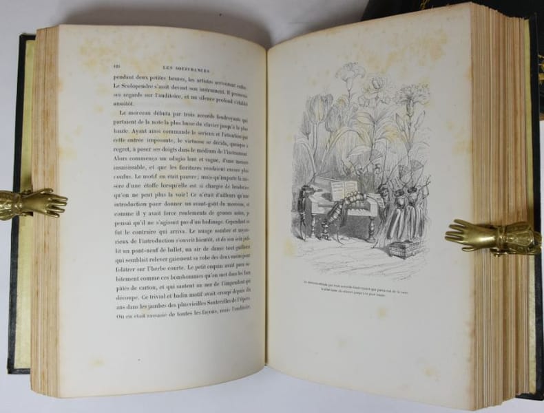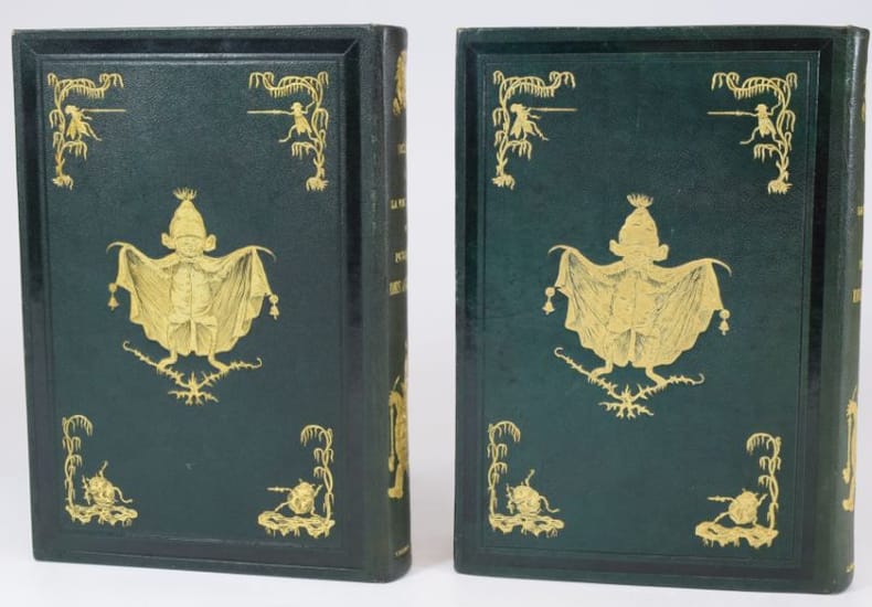 Paris, J. Hetzel et Paulin, 1842. 2 volumes grand in-8 (260 x 180 mm), (8)-386-(6) pp. et (4)-390-(6) pp., 96 et 105 hors-textes gravés sur bois, nombreuses vignettes dans le texte de Grandville. Reliure d'éditeur plein chagrin vert orné au dos et sur les plats des fers dessinés par Grandville. Quelques rares et claires rousseurs principalement sur les premiers et derniers feuillets, nom à l'encre sur le faux-titre du tome 2, dos du tome 2 légèrement éclairci, très bel exemplaire.