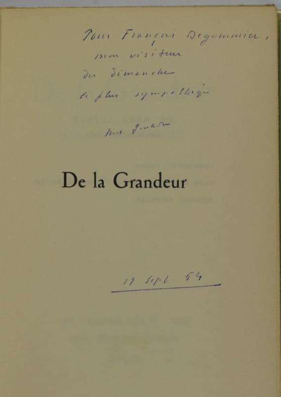 Paris, Grasset, 1952. 187 x 120 mm, 150-(4) pp. Broché sous couvertures rempliées, tranche sup. un peu empoussiérée, envoi sur page de faux-titre. Tirage à 1714 exemplaires numérotés, 1 des 1500 ex. sur papier Alfa mousse numérotés Alfa 1 à Alfa 1350 et S. P. 1 à S. P. 150, ex. n° Alfa 21. Très bel exemplaire, édition originale.