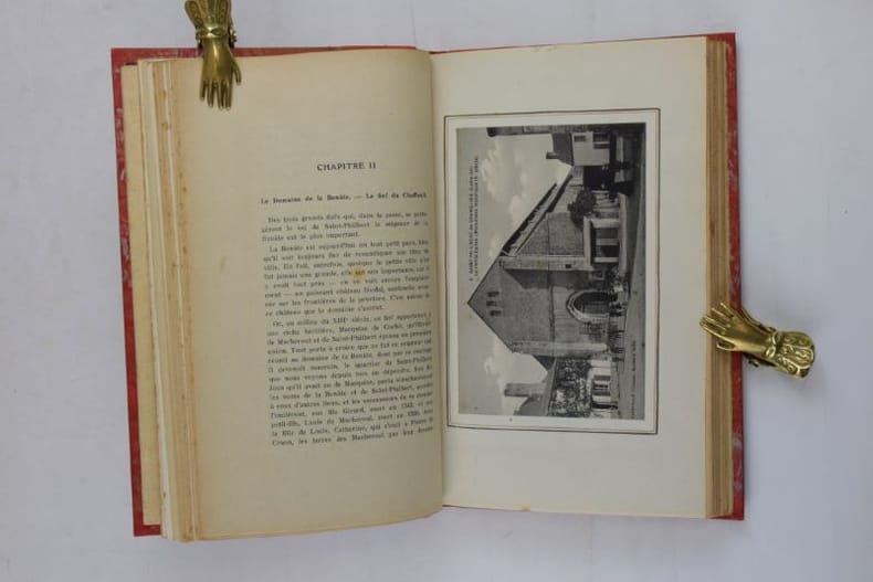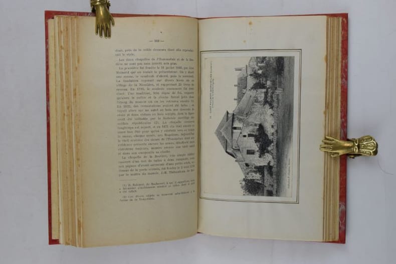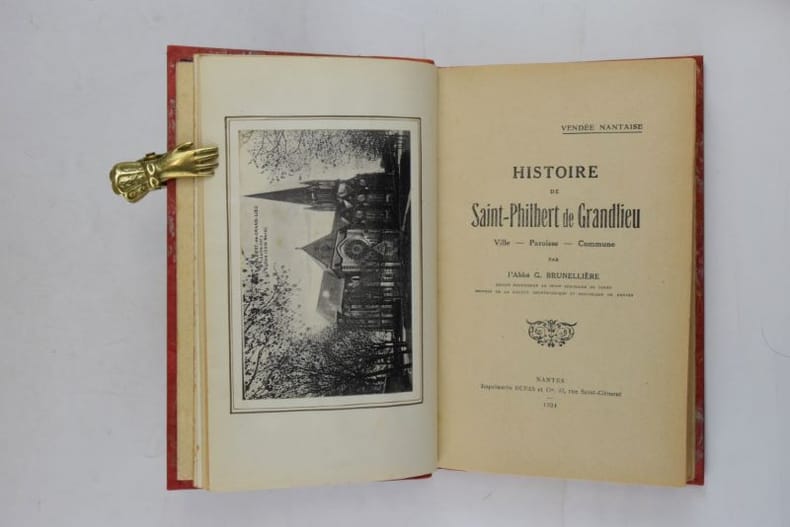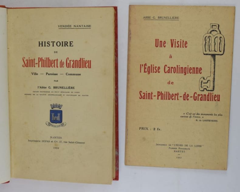 Nantes, Imprimerie Dupas, 1924. 223 x 140 mm, 398-(2) pp., frontispice et 8 pl. d'ill. n/b. Reliure demi-basane, dos à faux-nerfs, couvertures conservées, vignettes sur couvertures, dos insolé, rares piqûres de rousseurs dans les marges de quelques planches. Jointe : "Une visite à l'Église Carolingienne de Saint-Philbert-de-Grandlieu.", Imprimerie de "L'Écho de la Loire, Passage Pommeraye, Nantes, 1927. 215 x 135 mm, 22 pp., 1 photo n/b in-texte, 2 pl. d'ill, fascicule agrafé. Bon exemplaire.