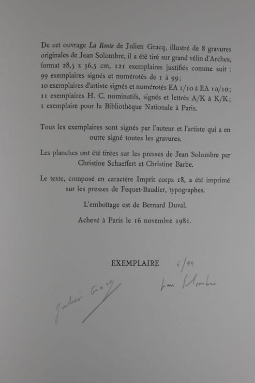 "Il a été tiré sur grand vélin d'Arches, format 28,5 x 36,5 cm, 121 exemplaires justifiés comme suit : 99 exemplaires signés et numérotés 1 à 99 ; 10 exemplaires d'artiste signés et numérotés EA /10 à EA / ; 11 exemplaires H. C., nominatifs, signés et lettrés A/K à K/K ; 1 exemplaire pour la Bibliothèque Nationale à Paris."