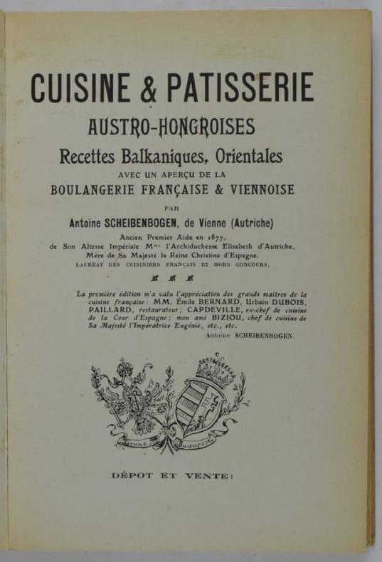 Deuxième édition corrigée et augmentée "par Antoine Scheibenbogen, de Vienne (Auriche) ancien premier aide en 1877, de son Altesse Impériale Mme l'Archiduchesse Elisabeth d'Autriche, Mère de Sa Majesté la Reine Christine d'Espagne. Lauréat des cuisiniers français et hors concours"."La première édition m'a valu l'appréciation des grands maîtres de la cuisine française : MM. Émile Bernard, Urbain Dubois, Paillard, restaurateur ; Capdeville, ex-chef de cuisine de la Cour d'Espagne ; mon ami Biziou, chef de cuisine de Sa Majesté l'Impératrice Eugénie, etc. etc.".