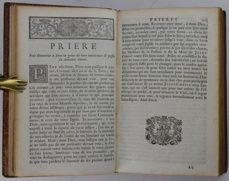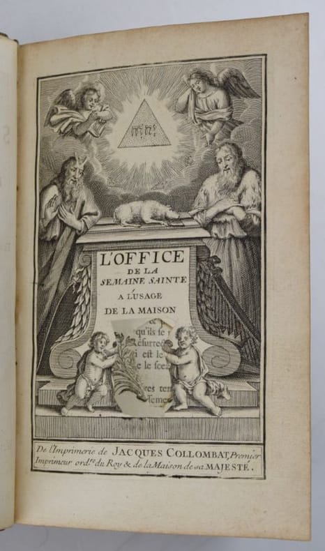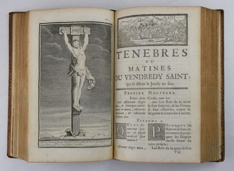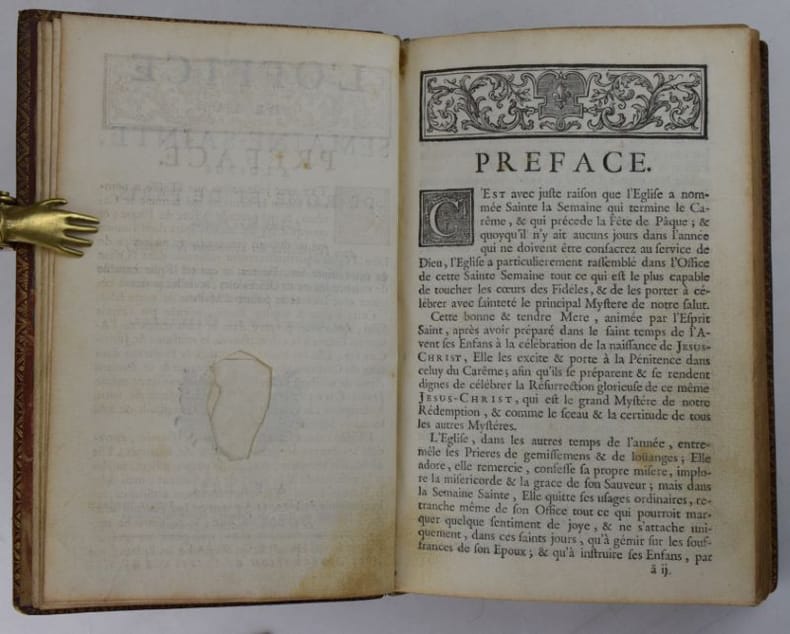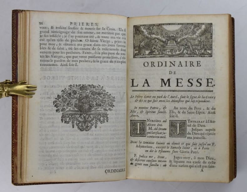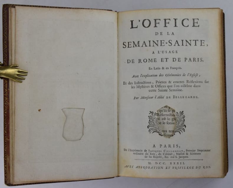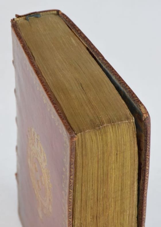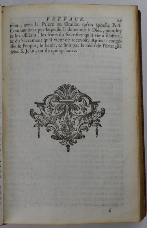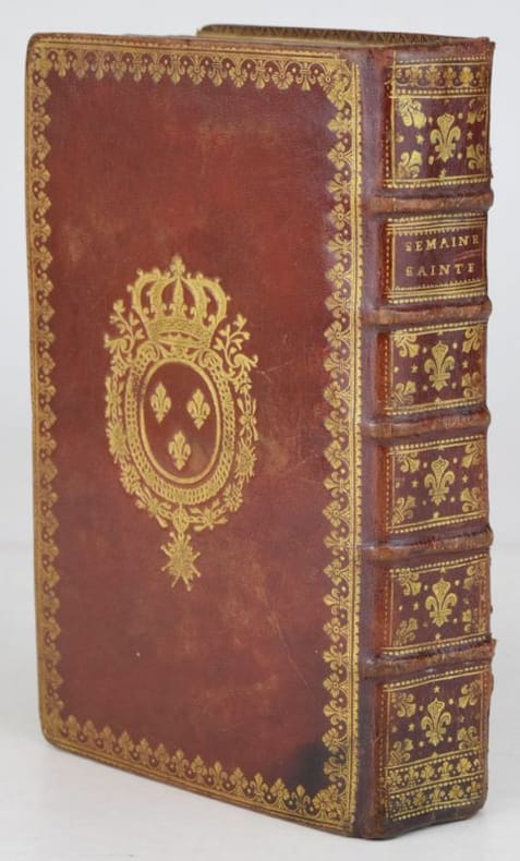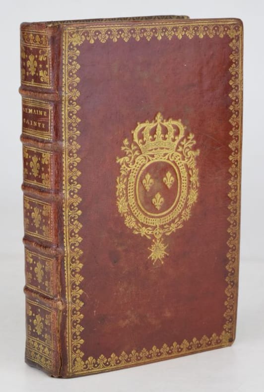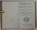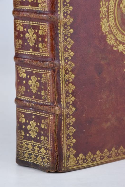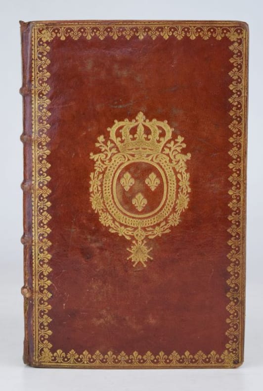 Paris, Jacques Collombat, 1732. In-8, XX-654-(2) pp., titre gravé (ajouté aux exemplaires réservés à la Maison du roi), 3 gravures hors-texte et bandeaux gravés.Reliure de l'époque en maroquin rouge, dos orné de fleurs de lys, roulette en encadrement et armes du roi Louis XV sur les plats, roulette sur les coupes et intérieure, tranches dorées. Mors sup. fendu en pied sur 7 cm, petit manque à la coiffe sup., 3 coins ouverts, tache sombre angulaire au second plat, plats frottés, les armoiries des feuillets de titre ont été caviardés.
