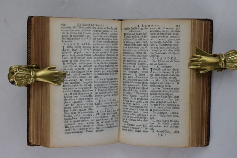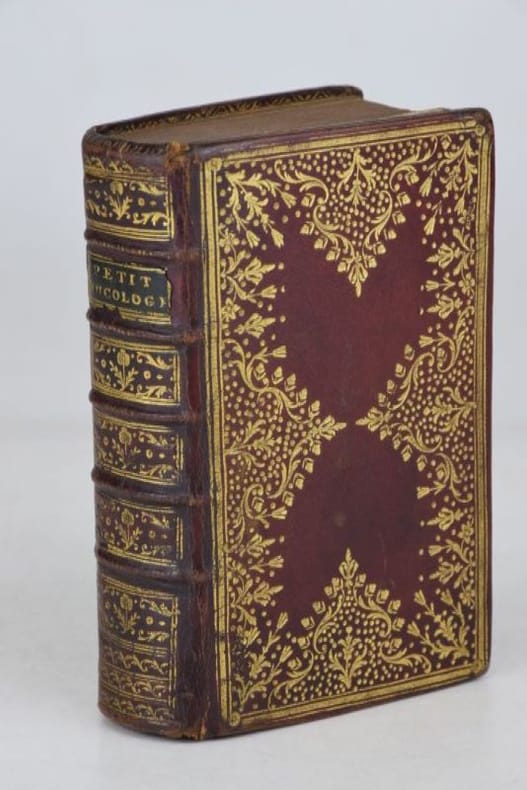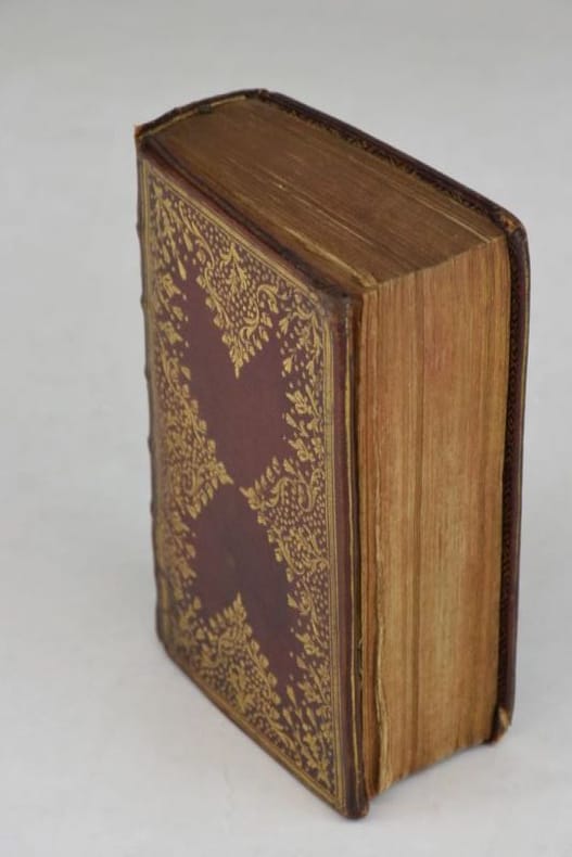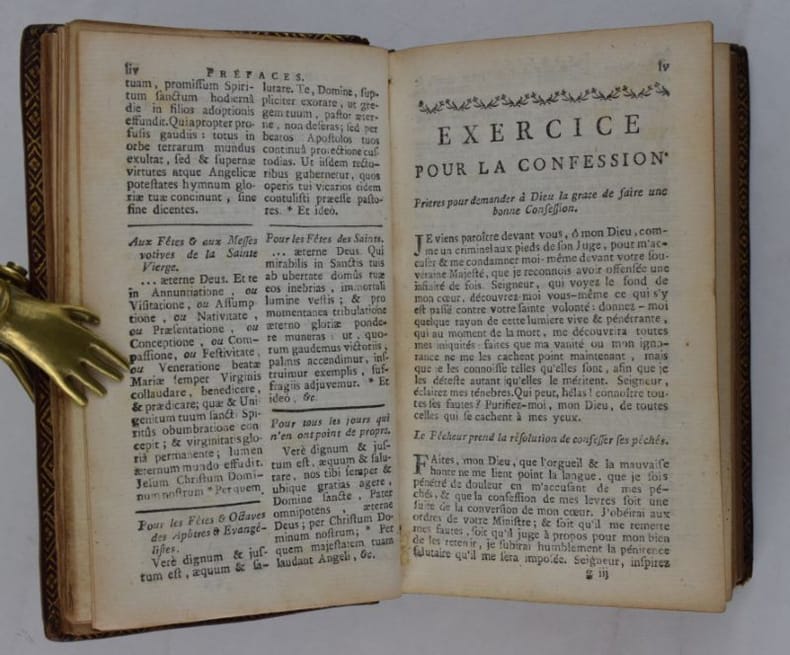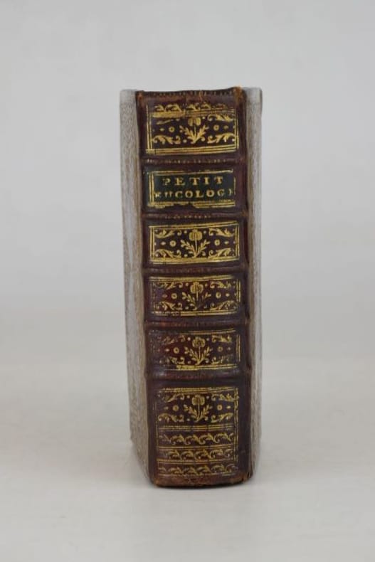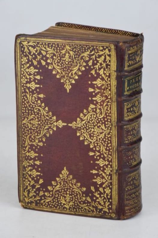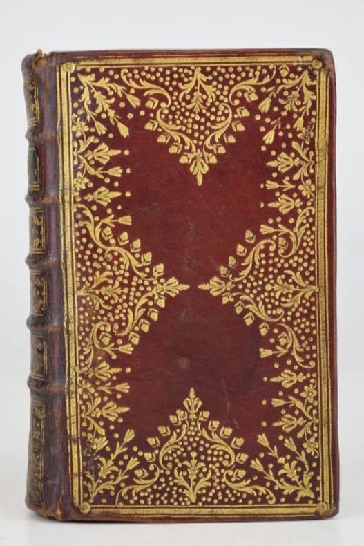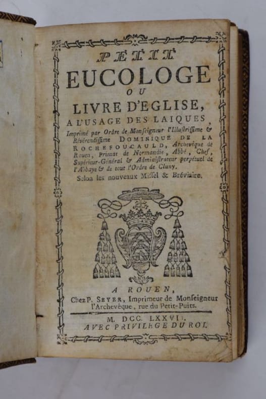Rouen, Chez P. Seyer, imprimeur de Monseigneur l'Archevêque, 1776. In-12, (22)-LXXIV-619-(17) pp. Reliure de l'époque en maroquin rouge, dos orné de caissons dorés, plats décorés d'une large dentelle aux petits fers, tranches dorées, filet sur les coupes et roulette intérieure. On connaît plusieurs livres d'église, types Heures ou Eucologue, imprimés à Rouen par Pierre Seyer entre 1775 et 1785 avec ce décor très caractéristique de dentelle remplie aux petits points. On peut raisonnablement supposer que Pierre Seyer avait aussi un atelier de reliure ou s'était attaché les services d'un atelier de reliure de son voisinage.Inscriptions sur le feuillet de garde, rousseurs, 1 cahier décalé, petits accrocs aux coiffes, 1 coin choqué avec manque de cuir.