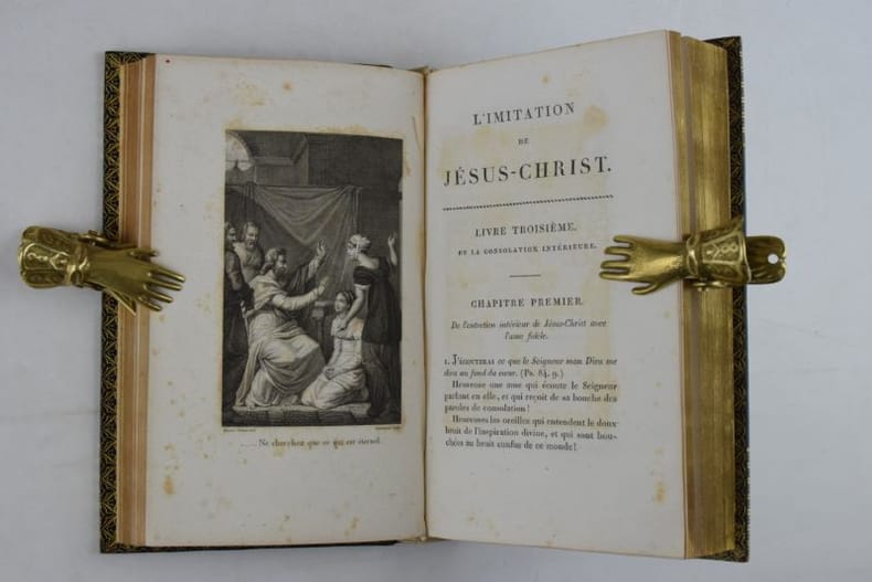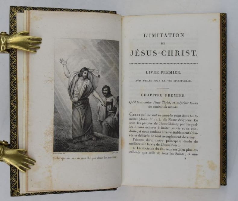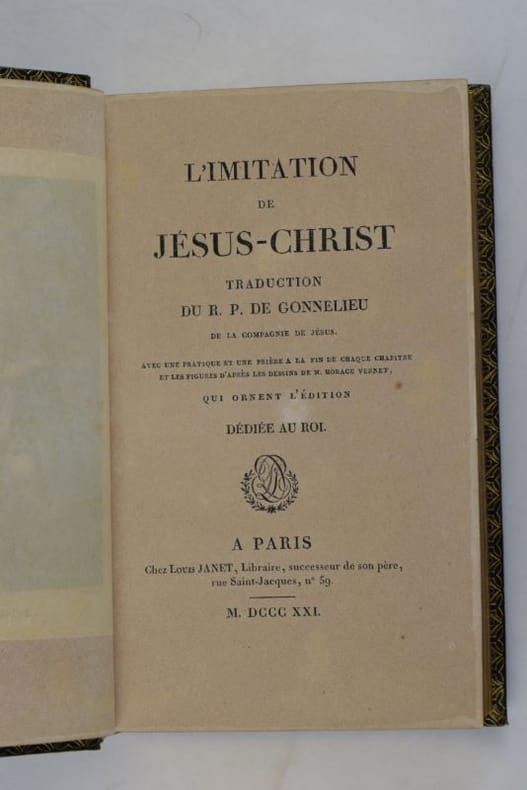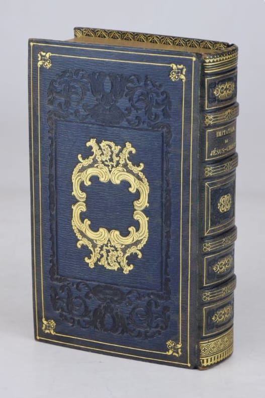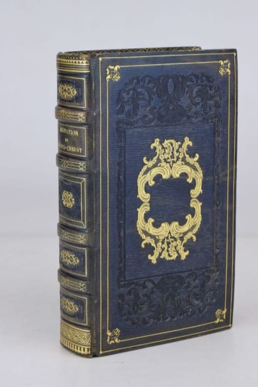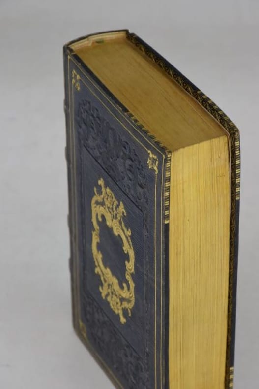 Paris, Louis Janet, 1821. In-12, VIII-580 pp., orné d'un frontispice et de 4 gravures. Reliure de l'époque en maroquin bleu, dos à larges nerfs orné de caissons à froid et fleurons dorés, plats ornés d'une plaque à froid à motifs de feuillages et d'un décor doré de style rocaille, roulette intérieure, tranches dorées, inscription ancienne sur page de garde, premiers et derniers feuilles roussis, quelques rousseurs éparses, dos et bordures des plats légèrement insolés, minimes frottements, bel exemplaire.