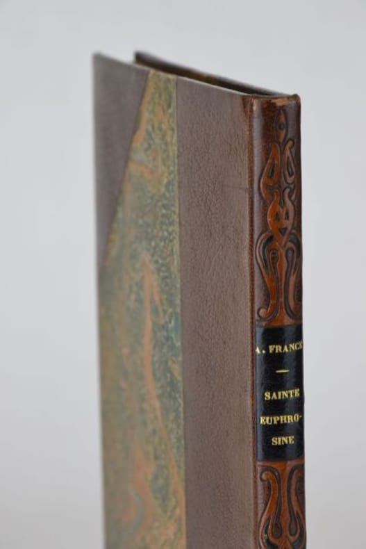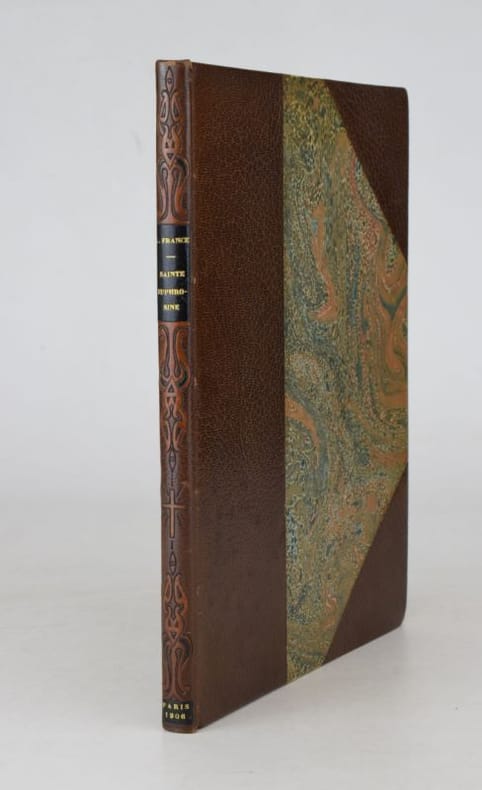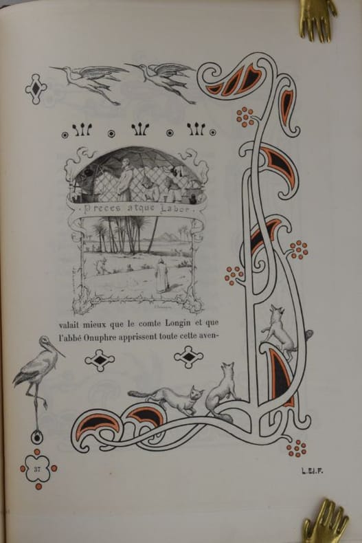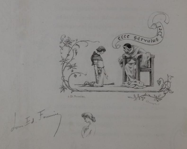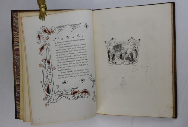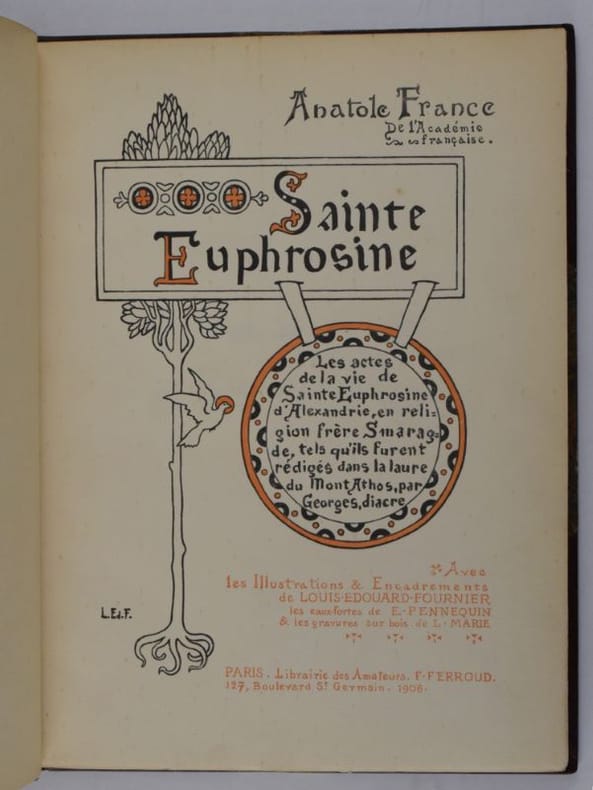 Paris, Librairie des Amateurs, F. Ferroud, 1906. Petit in-4 carré, (4)-47-(1) pp, les 4 pages du prospectus de souscription sont reliées à la suite, 13 compositions de Louis-Édouard Fournier gravés à l'eau-forte par E. Pennequin et encadrements en couleurs gravés sur bois par L. Marie. Tirage à 225 exemplaires, celui-ci non numéroté mais l'un des premiers 80 sur vélin du Marais, contenant deux états des eaux-fortes dont l'état avec remarque signé au crayon par L. É. Fournier et la suite des encadrements sur Chine.Reliure de l'époque, demi-maroquin havane à coins, dos orné d'un décor en mosaïque reprenant l'encadrement du texte, tranche supérieure dorée, couvertures et dos conservés, reliure signée "Blanchetière. Bretault". Henri Blanchetière fut le gendre et successeur de J. Bretault en 1906, il mourut en 1933. (Fléty, 26 ; Carteret V-84 "Édition estimée"). Minimes frottements aux mors et à la coiffe supérieure, très bel exemplaire.
