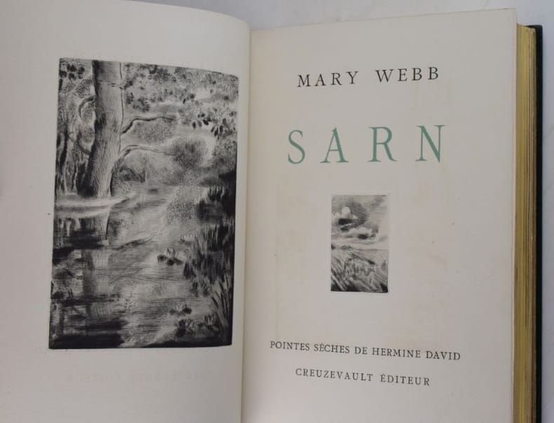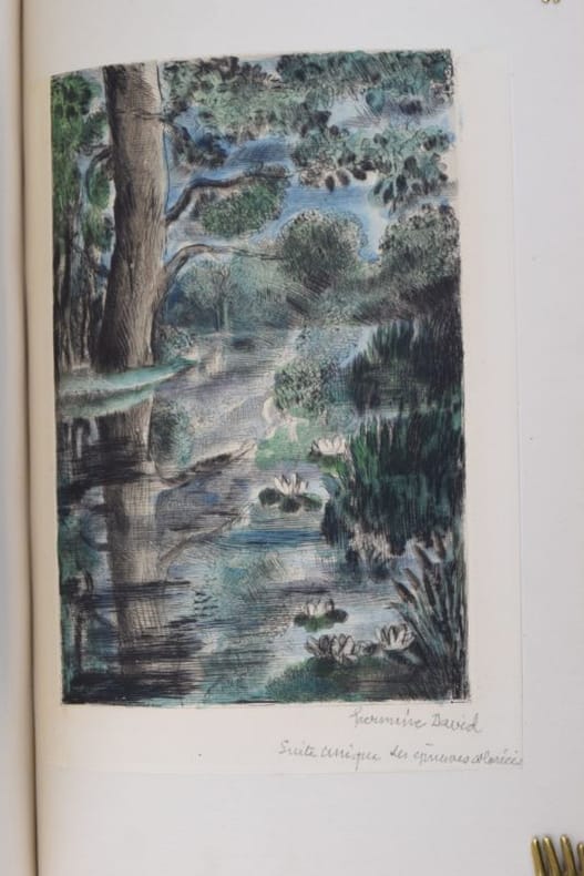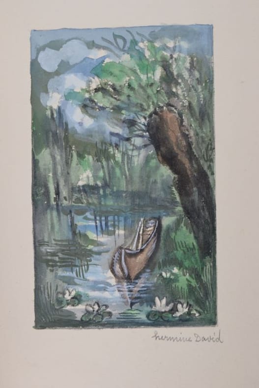 Paris Creuzevault 1948 In-4, en feuilles, couverture imprimée (emboîtage de l'éditeur).32 pointes sèches originales par Hermine David, dont une sur la couverture, un frontispice, une vignette de titre et 29 en-têtes. Tirage limité à 240 exemplaires numérotés. Exemplaire de collaborateur sur arches comportant, comme les 40 premiers exemplaires sur ce même papier, une suite en noir sur malacca.