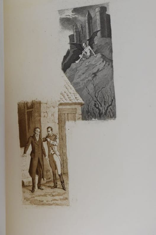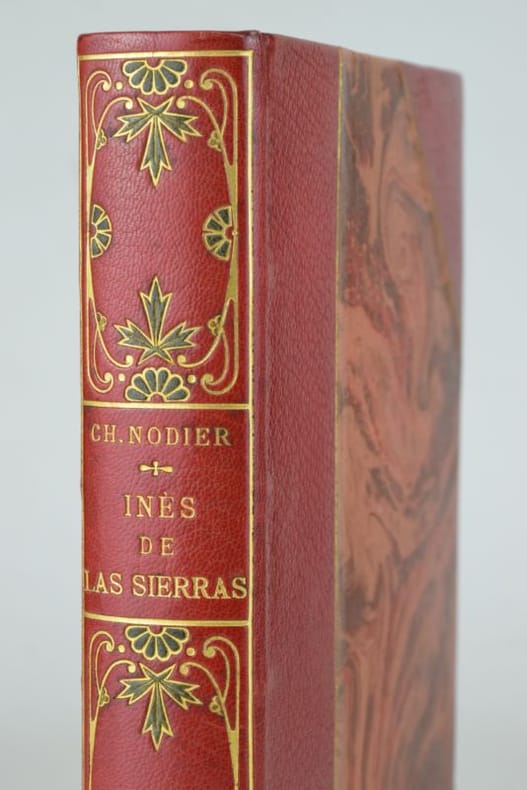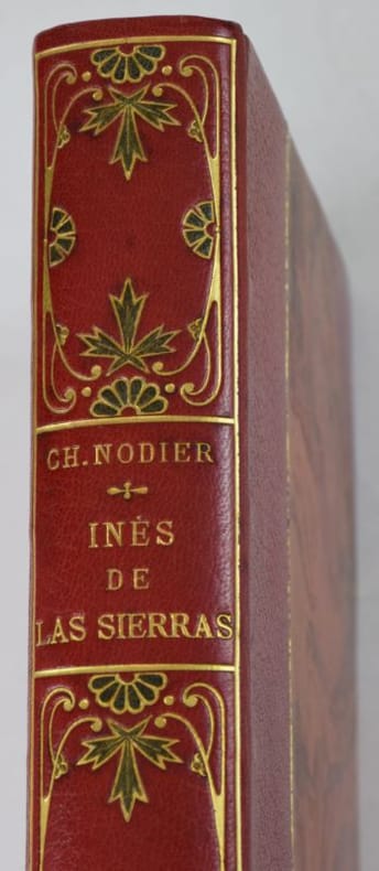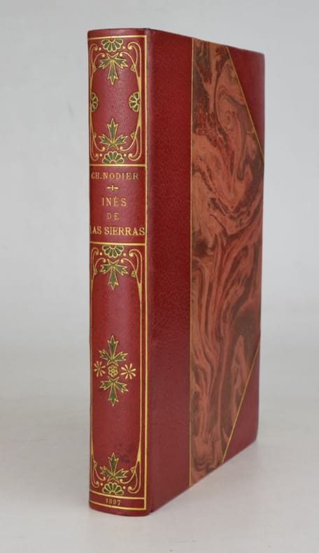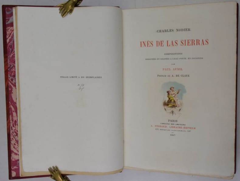 Paris, A. Ferroud, 1897. In-4 (279 x 193 mm), XXIX-(1)-108 pp., 15 illustrations à l'eau-forte en couleurs de Paul Avril in-texte, vignette couleurs sur la page de titre. Reliure de l'époque demi-maroquin à coins, dos lisse orné d'un décor mosaïqué en or et vert, tranche sup. dorée, couvertures et dos conservés, vignette en couleurs sur la première de couverture. Reliure signée de Charles Lanoë (1881-1959), relieur-doreur, collaborateur de Petrus Ruban à partir de 1903, il lui succéda en 1910.Tirage à 200 exemplaires numérotés, ex. n° 73 sur un fort papier vélin au filigrane de l'éditeur. Augmenté de la décomposition des couleurs de toutes les illustrations (2 à 4 couleurs par planche). Très bel exemplaire.