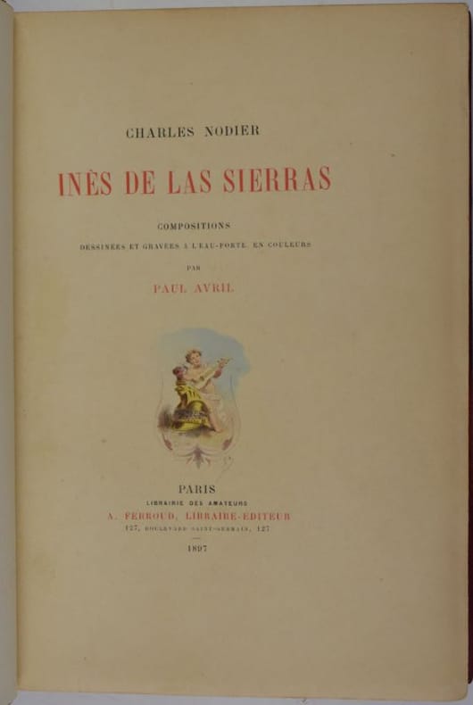 Paris A. Ferroud 1897 In-4, broché, couverture imprimée.16 eaux-fortes originales en couleurs de Paul Avril. Tirage unique limité à 200 exemplaires numérotés sur vélin chiffon, celui-ci enrichi d'une décomposition des couleurs pour chaque illustration (2 à 4 couleurs selon les gravures).