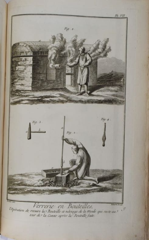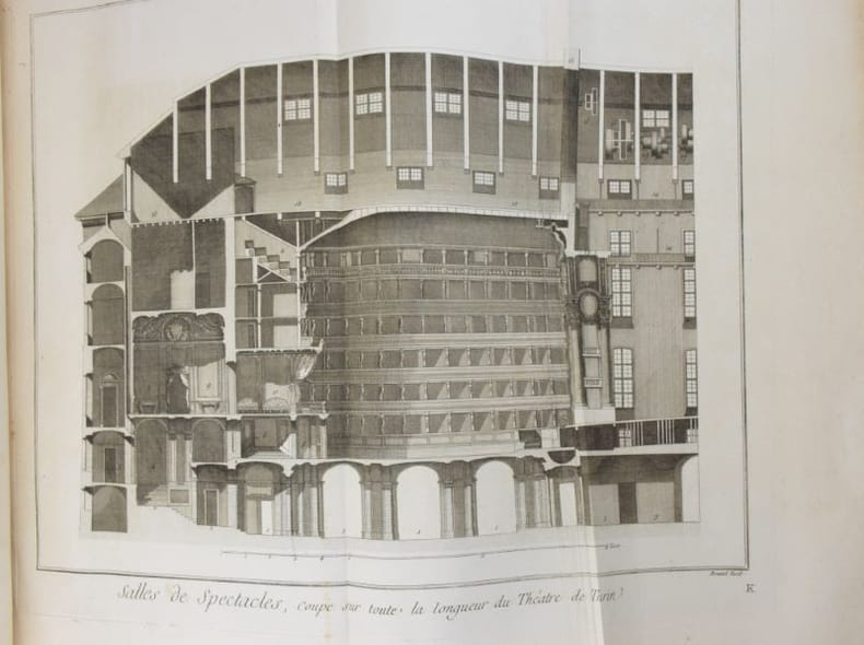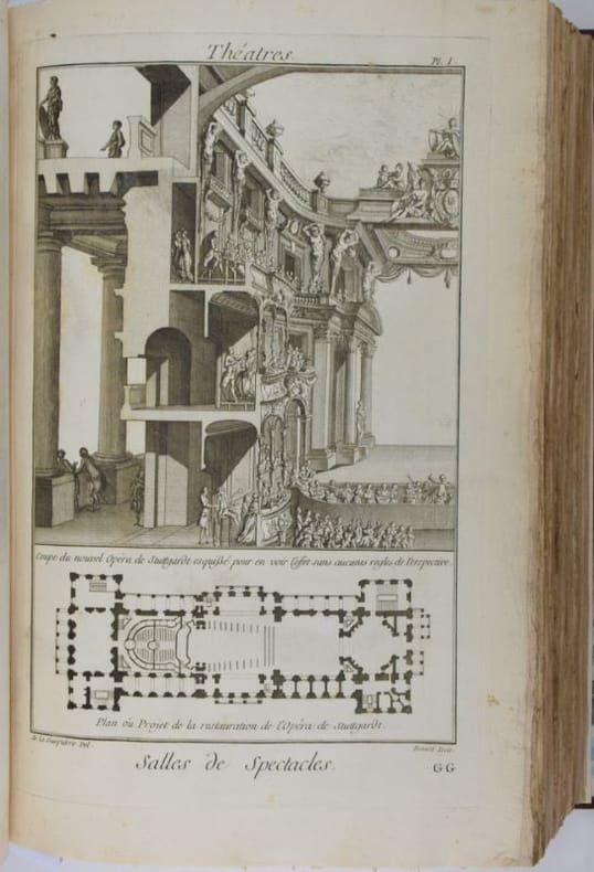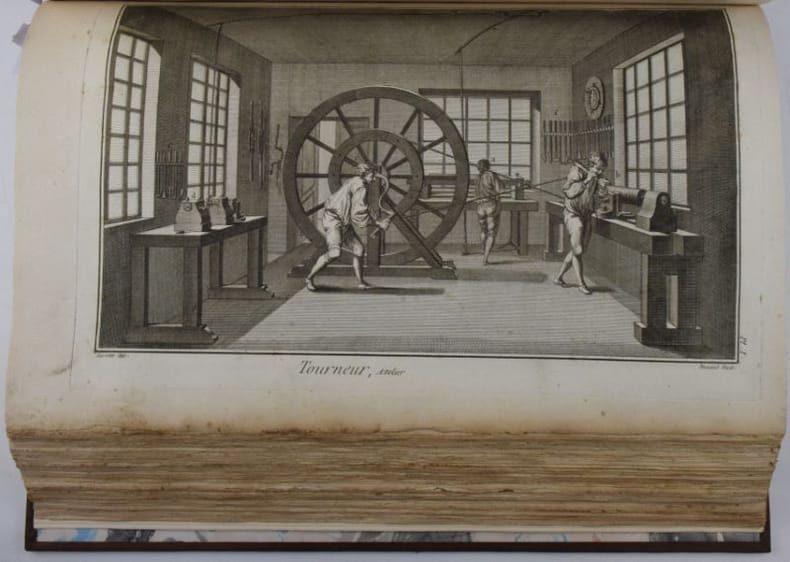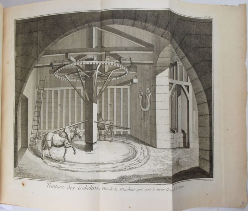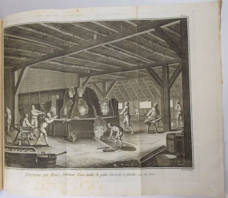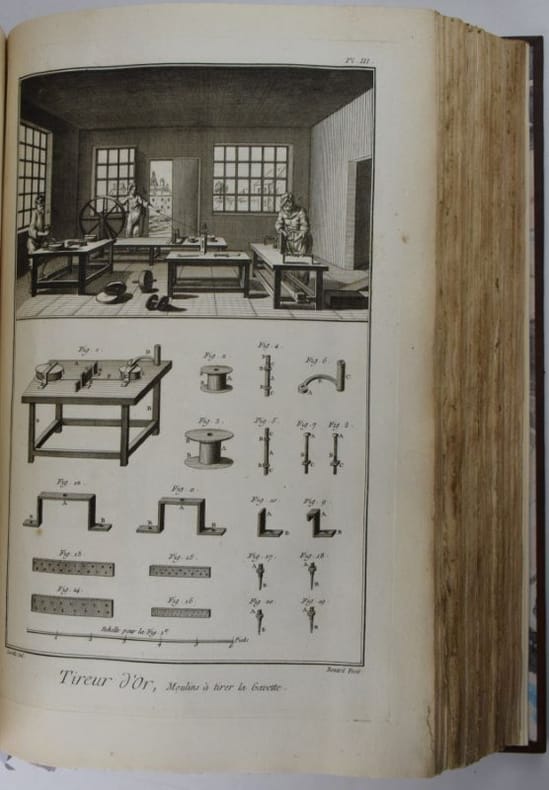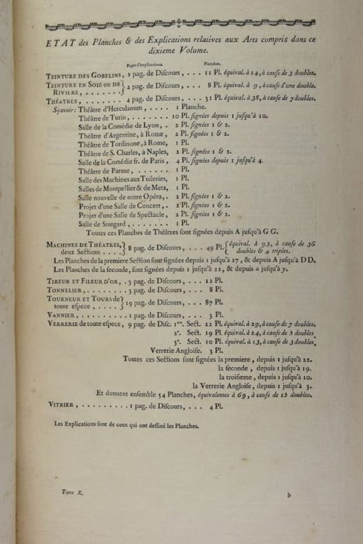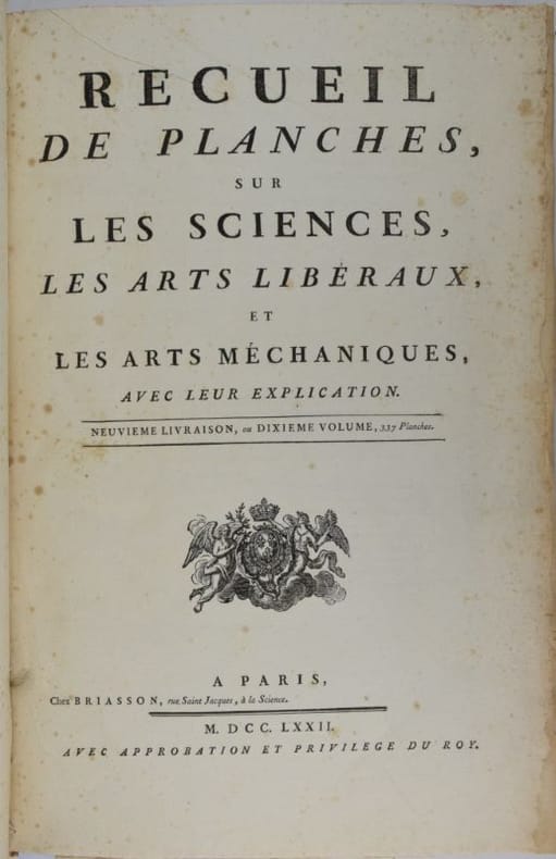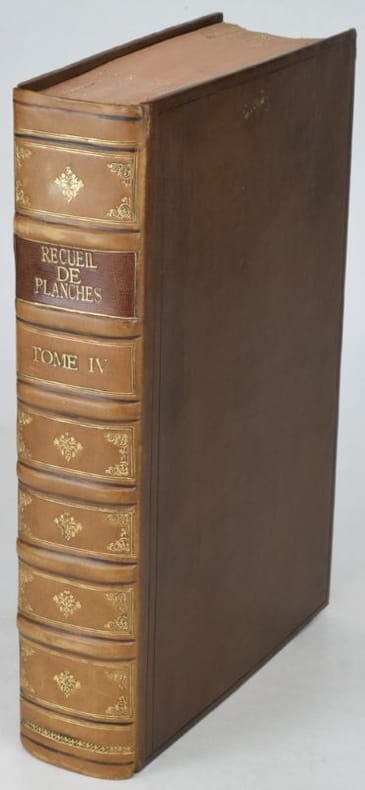 Paris, Chez Briasson, 1771. In-folio (268 x 404 mm), (3) ff. : faux-titre, titre, "Etat des Planches & des Explications relatives aux Arts compris dans ce dixième Volume.", Certificat de l'académie/ Approbation/Privilège du Roi/Avis du Libraire, (28) feuillets de présentation des planches ordonnés par sujet et insérés en tête des planches correspondantes. 337 planches (COMPLET), les planches doubles ou triples sont comptées pour 2 ou 3 planches. Reliure moderne basane, dos à nerfs orné de caissons dorés, dos insolé, minimes frottement aux mors, dos et coins, rares planches avec décharges ou papier un peu bruni, rares piqûres de rousseurs sinon papier bien blanc, bel état. Bel exemplaire.Texte et planches en détail : (1) f. "Teinture des Gobelins", 11 pl. dont 3 doubles, équivalant 14 ; (1) f. "Teinture en Soie ou de Rivière", 8 pl. dont 1 double, équival. 9 ; (2) ff. "Théâtres", 31 pl., dont 7 doubles, équival. 38, (4) ff. "Machines de Théâtres", 49 pl., dont 36 doubles et 4 triples, (2) ff. "Tireur et fileur d'or", (2) ff., 12 pl. ; (2) ff. "Tonnelier", 8 pl. ; (10) ff. "Tourneur et tour à figure", 87 pl., (1) f. "Vannier", 3 pl., (4) ff. "Verrerie", 54 pl. dont 15 doubles, équival. 69 pl. (1) f. "Vitrier", 4 pl.