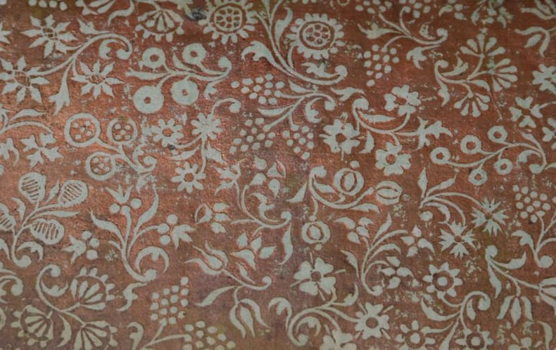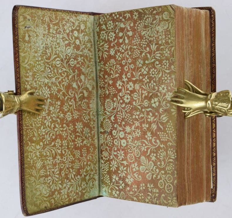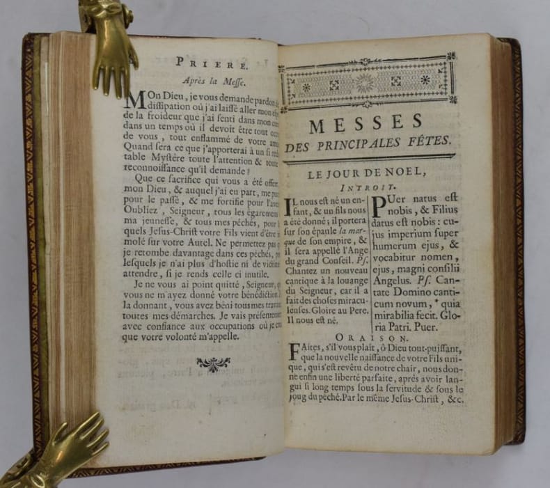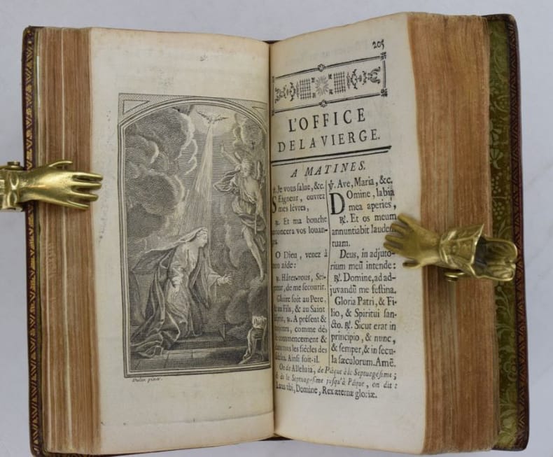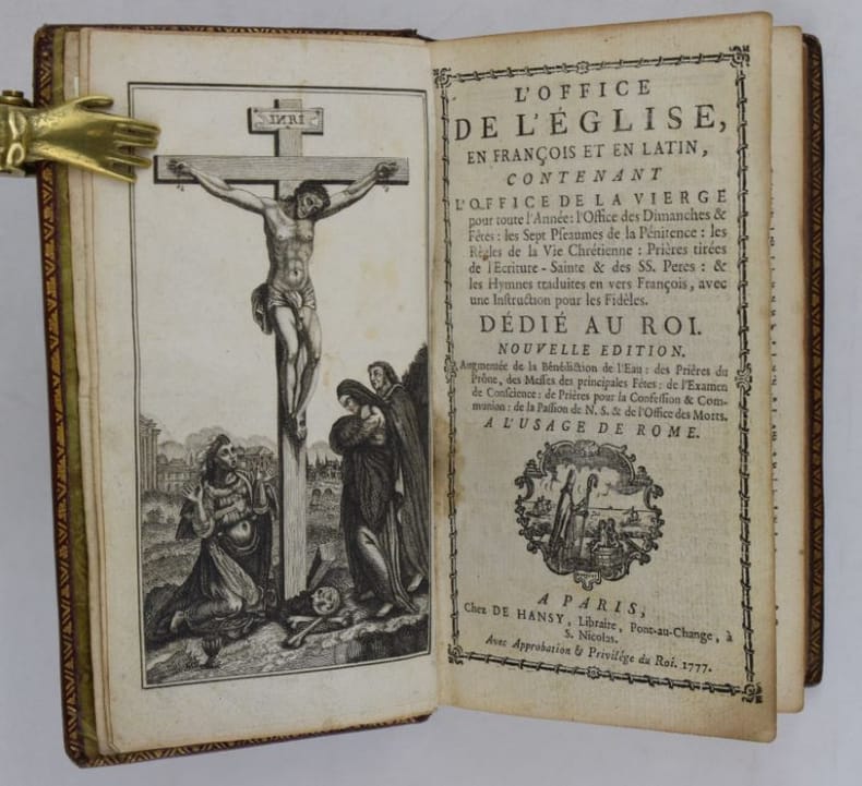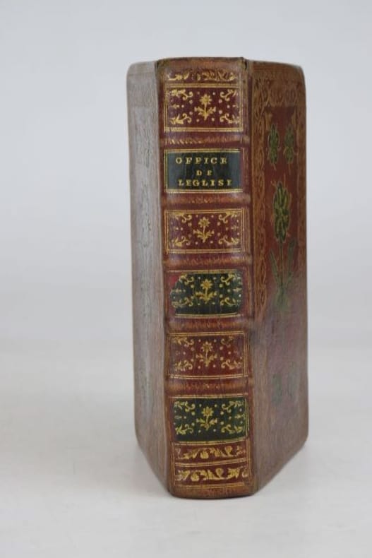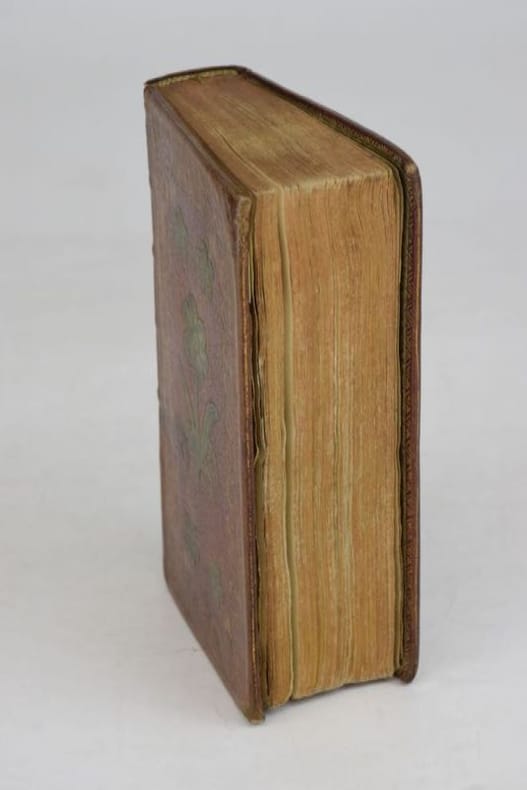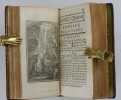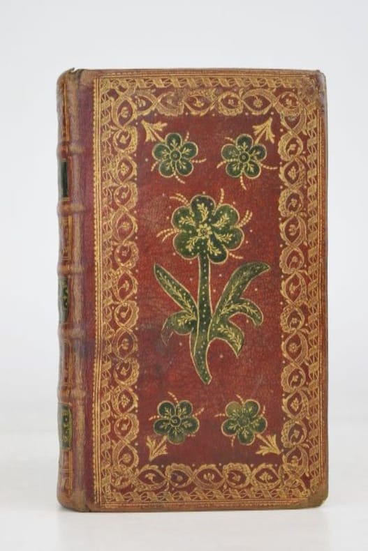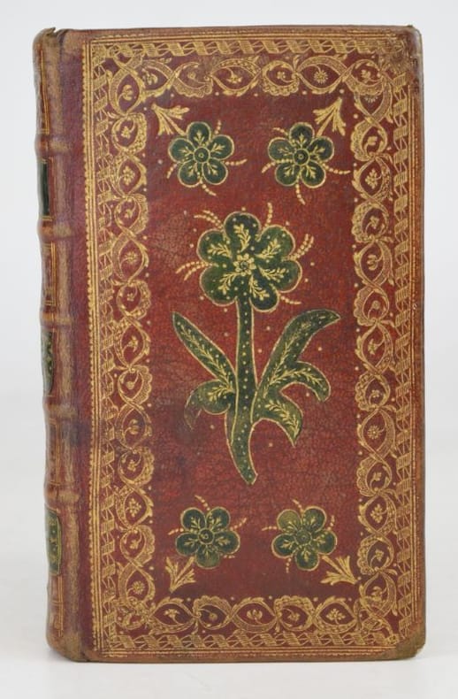 Paris, De Hansy, 1777. In-12, (16)-584 pp., frontispice et une planche. Reliure de l'époque en maroquin rouge, dos orné d'un fer floral avec pièces alternées en maroquin vert, plats encadrés de filets et de deux roulettes, fleurs mosaïquées au centre et dans les angles, filet sur les coupes, roulette intérieure, papier de garde à motifs floraux en vert sur fond doré, tranches dorées. Étiquette de l'époque de la librairie Chappuis frères à Bordeaux collée sur le contreplat, minimes frottements, petit manque à la coiffe sup., un coin ouvert, manque en bordure à deux pièces du dos et à la fleur centrale du second plat. Bel exemplaire.