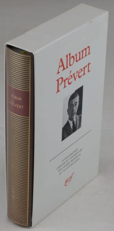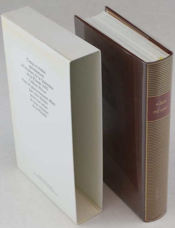 Paris, nrf-Gallimard, 1992. In-12 (11 x 18 x 3 cm), relié, reliure éditeur plein cuir brun, filets dorés et titre doré sur fond rouge au dos, rhodoïd, étui illustré. Portrait de Prévert en frontispice, 443 pages, très nombreuses illustrations. Index. // Joint: tirage à part remis gracieusement à l’occasion de la parution originale du tome I des Œuvres complètes de Jacques Prévert dans la collection de la Pléiade. 1992. Brochure agrafée de 48 pages imprimée sur papier bible. // Très bon état.