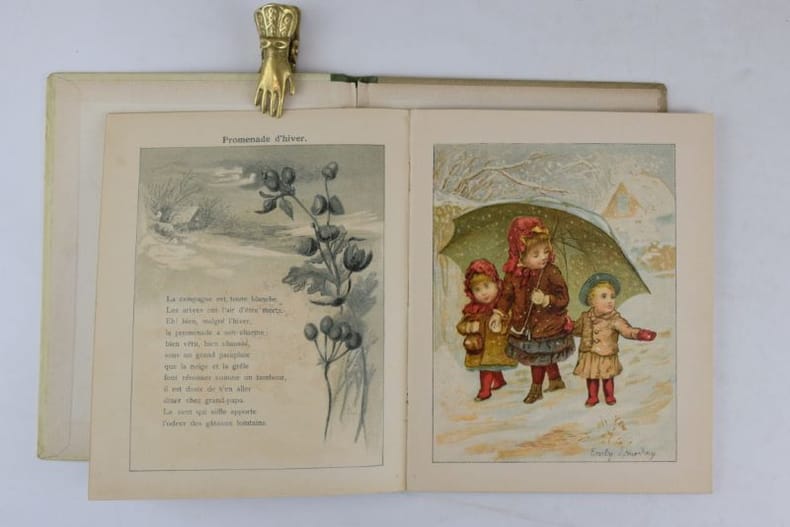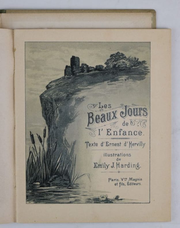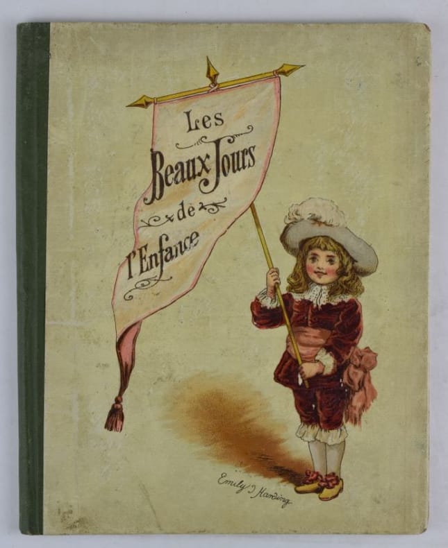 Paris, Vve Magnin et fils, s.d. (vers 1890). In-12 carré (15 x 18.6 cm), 20 pp., illustrations in-texte et 8 planches en chromolithographie d'Emily J. Harding. Agrafé sous couvertures illustrées demi-percaline. Les agrafes ont rouillé et le corps d'ouvrage est désolidarisé de la couverture, plats salis.