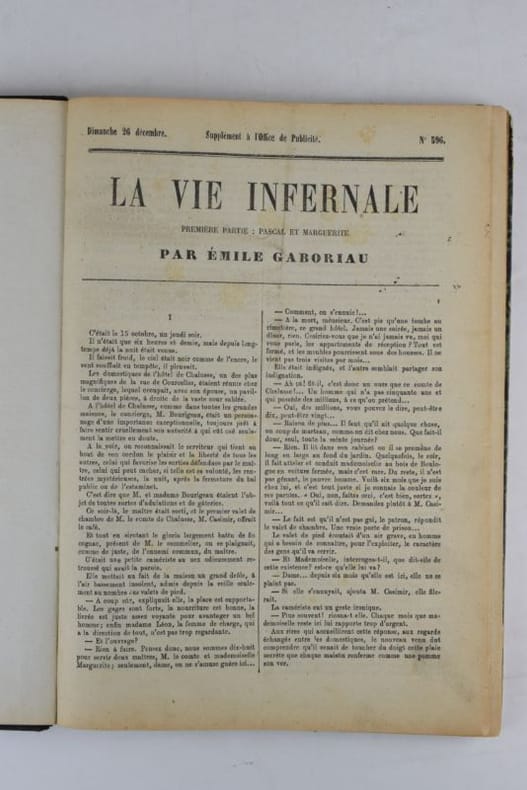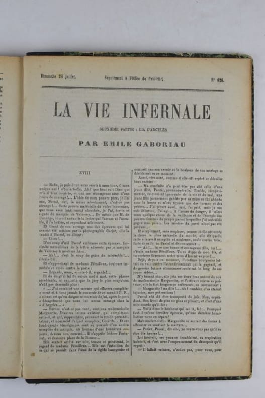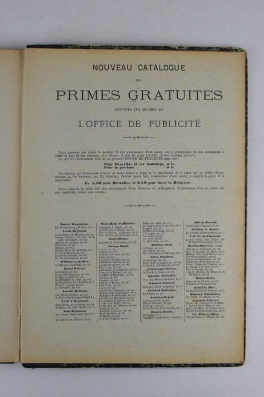 300 x 209 mm, 245-(1) pp., (1) f. "Nouveau catalogue des primes gratuites offertes aux abonnés de l'office de publicité". Roman complet dans la première publication en livraisons. Reliure d'époque demi-toile, reliure défraîchie : coiffes arrachées et mors fendus, coins ouverts, claires rousseurs sur premier et derniers feuillets, ex-libris manuscrit sur la page de garde.
