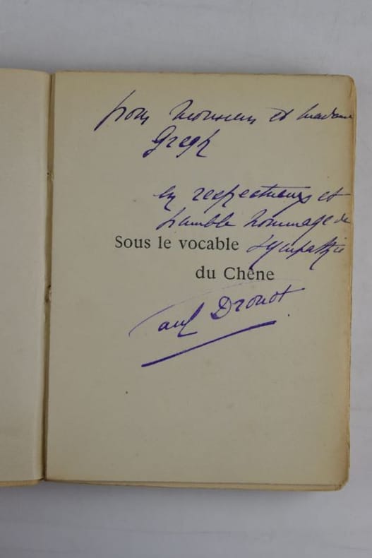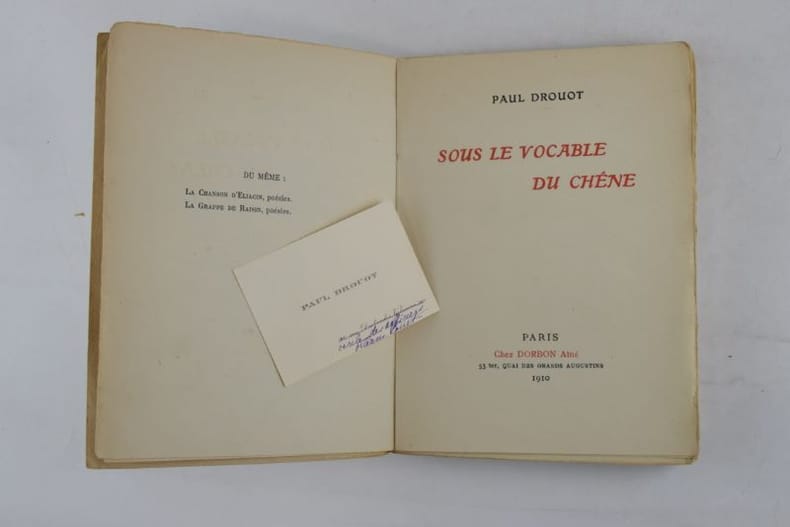 Paris, Chez Dorbon Aîné, 1910. 186 x 136 mm, (5) ff. dont faux-titre et titre, 166-(4) pp., édition originale, envoi de l'auteur au poète Fernand Gregh. Broché, charnières en partie rompues, cahiers en voie d'être déreliés, de ce fait fort pli au dos (voir photo), trace noire en bas de la première de couverture, couvertures et dos légèrement empoussiérés.