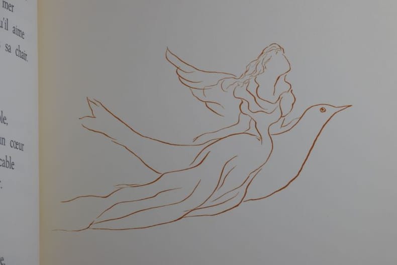 Les Éditions de Pujols, 1965. 276 x 206 mm, (1) f., serpente, 121-(1) pp., (4) ff., 7 illustrations en pleine page, dessins d'Irène Lagut. Reliure cuir argenté, un des 143 exemplaires sur vélin B. F. K. de Rives, numérotés de 1 à 143, exemplaire n° 56, tirage à 149 exemplaires constituant l'édition originale, "Les passes d'imprimerie ont été détruites". Très bel exemplaire. Édition originale.