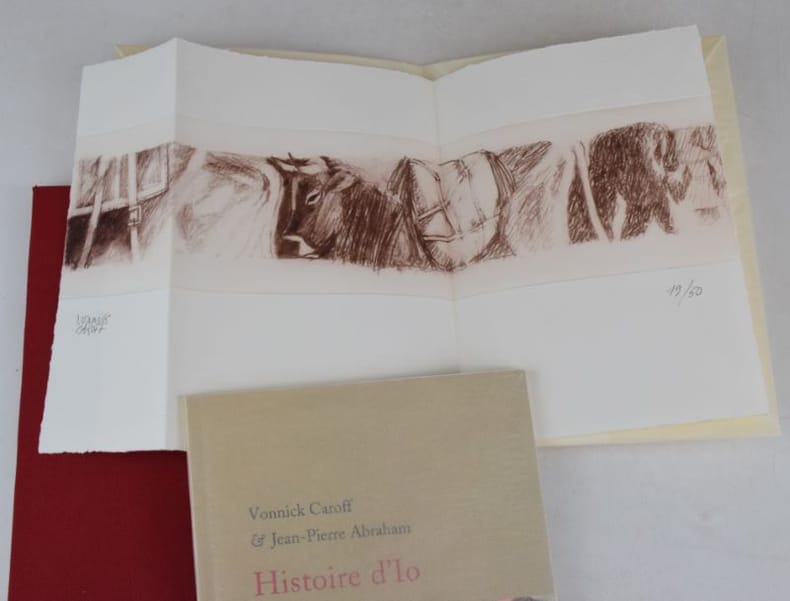 s. l., Le temps qu'il fait, 2002. 220 x 162 mm, 17-(1) pp., (15) ff., illustrations couleurs de Vonnick Caroff. Broché sous couvertures à rabat et étui toile, joint : 1 lithographie originale justifiée et signée par Vonnick Caroff. Les cinquante premiers exemplaires numérotés de 1 à 50 comportent chacun une lithographie originale justifiée et signée par l'artiste imprimée par Peter et Christina Rall à Zürich. Ex. n° 19/50.