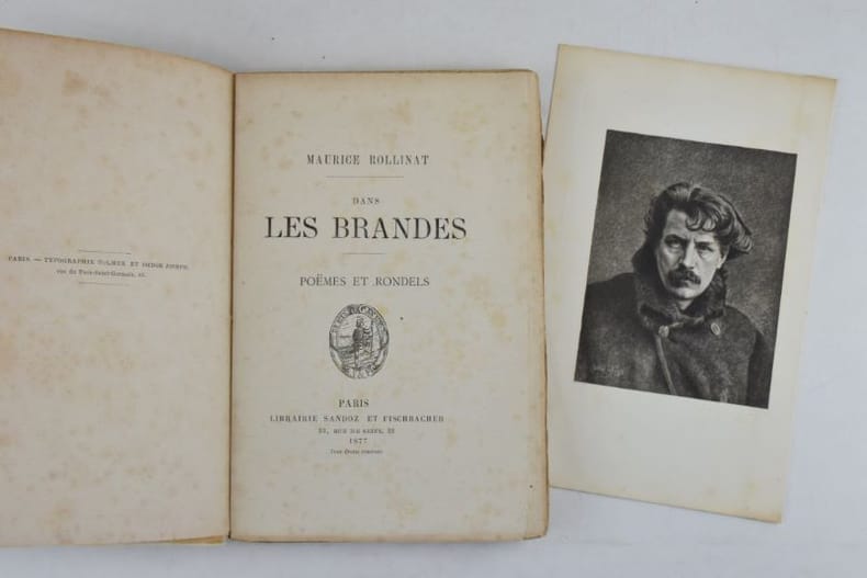 Paris, G. Charpentier et Cie, éditeurs, 1883, in-8vo, 2 ff. (faux-titre et titre) + 281 p. (+ 3 n. ch.), envoi sur faux-titre ‘A Madame Alphonse Daudet bien cordialement (signé) Maurice Rollinat’, cachet rond sur page de garde, de la bibliothèque de ? (au chiffre ‘J A D’ & ‘ne oubliez’) , reliure en d.-toile originale, pièce de titre en cuir au dos filets, fleuron et date dorés au dos. Couverture de la brochure cons. Bel exemplaire (signé Paul Vié).
