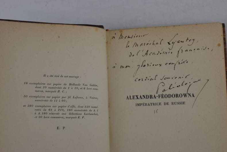 Paris, Librairie Plon - Les Petits-Fils de Plon et Nourrit, 1932. 183 x 118 mm, (4) ff. dont faux-titre, titre, 254-(2) pp., 1 portrait n/b en frontispice. Reliure demi-chagrin, dos à faux-nerfs orné de fleurons dorés, tranche sup. dorée, initiales en pied du dos, ex-libris collé sur contre garde, couvertures et dos conservés, mors frottés (épidermures), 1 coupe frottés, 1 des 50 ex. hors commerce marqué E. P., envoi au maréchal Lyautey sur le faux-titre.