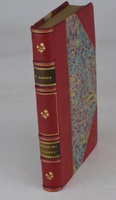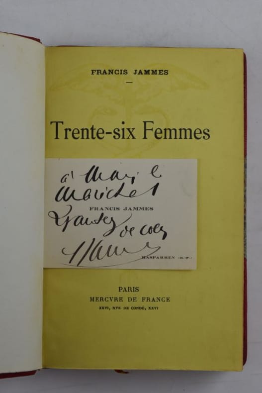 Paris, Mercure de France, 1926. 182 x 116 mm, (1) f., 248-(2) pp. Reliure demi-chagrin à coins, dos à faux-nerfs orné de fleurons dorés, tranche sup. dorée, couvertures conservées, tache au second plat, joint : 1 carte de visite de F. Jammes avec un envoi au maréchal Lyautey. Bel exemplaire.