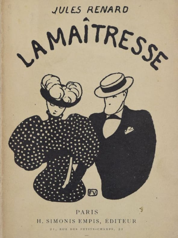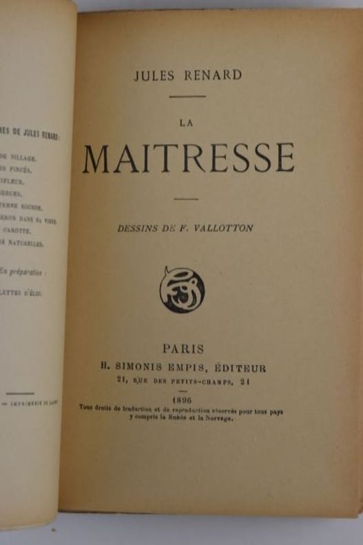 Paris, H. Simonis Empis, 1896. 187 x 117 mm, (2) ff. : faux-titre, titre, 221-(5) pp., dessins n/b de F. Vallotton. Broché, la première de couverture est illustrée en n/b par Félix Vallotton, dos insolé, minime manque de papier en pied du dos, minime déchirure (sans manque de papier entre dos et quatrième de couverture), couvertures légèrement empoussiérées. Bon exemplaire. Édition originale.