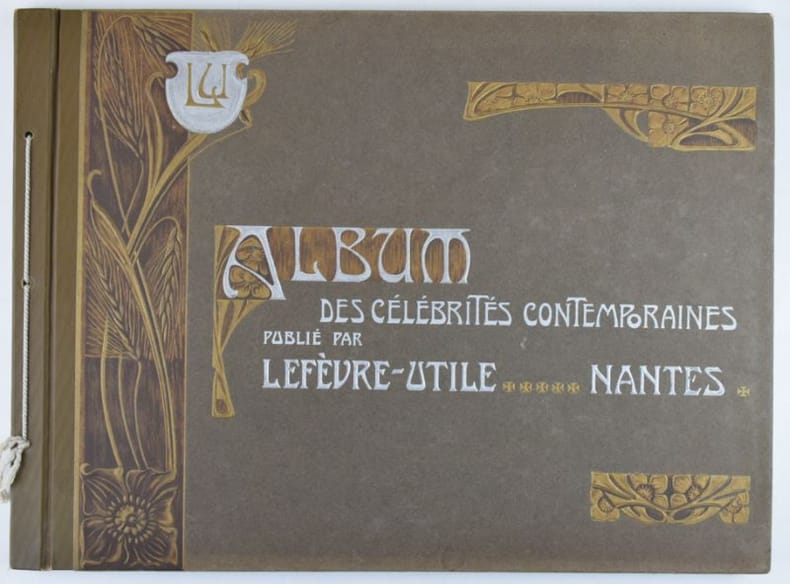 Nantes, Lefèvre-Utile, s.d. (autour de 1900). 1 vol. in-4 oblong. Reliure éditeur, dos percaline, cartonnage de papier gaufré, titre argenté et gaufré sur le premier plat, lacet dattache. Guirlandes Art Nouveau en relief sur le premier plat. Dix planches sur papier gris foncé, montées sur onglets.Fentes d'insertion pour les 48 cartes insérée (3 par page). Album publicitaire réunissant 48 cartes chromolithographiées, gaufrées et rehaussées dor. Elles font partie de la série autographe : chaque carte comprend un portrait photographique et une phrase autographe à la gloire du biscuit.Elles ont été dessinées par les grands illustrateurs de lépoque dont Benjamin Rabier, Poulbot, Luigi Loir, Alfons MuchaOn trouve notamment les portraits de Sarah Bernhardt, Melle Breval, Mme Réjane, Benjamin Rabier, Georges Feydeau, Léandre, Albert Guillaume, Edmond Haraucourt, Tristan Bernard, Alphonse Allais, Victorien Sardou...Cet album ne comprend pas les huit cartes chromolithographiées de la série des avionsen fin d'album