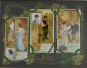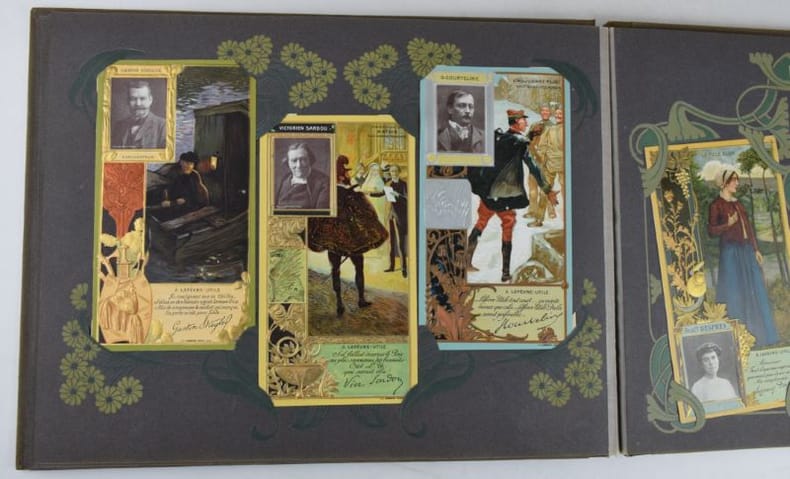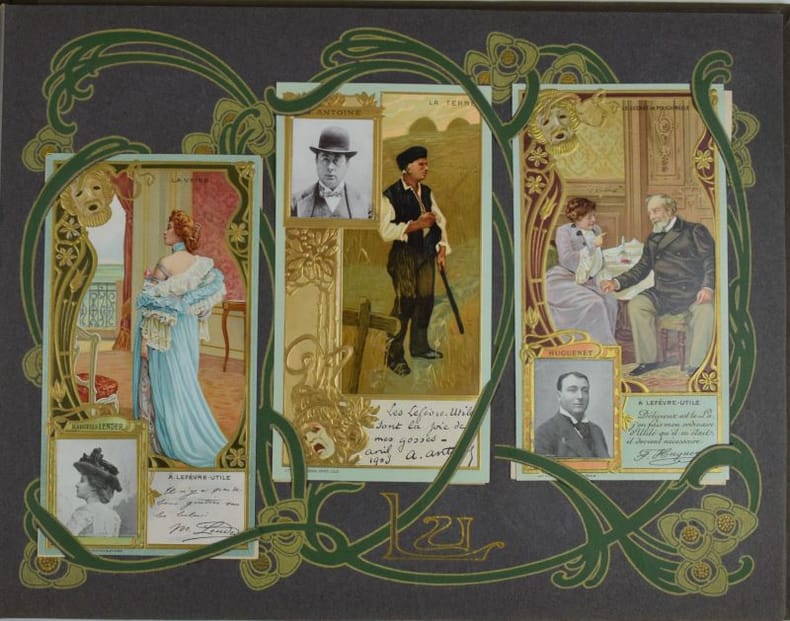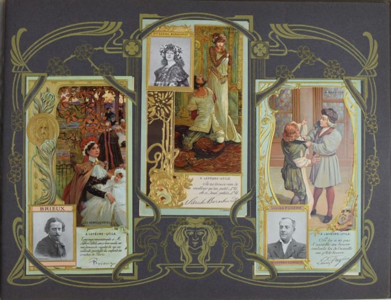 Exceptionnel ensemble de cartes chromolithographiées, provenant des paquets de gâteaux L.U., collectionnées par les enfants et les plus grands. Les cartes sont rangées dans cet album publicitaire grâce au support dans un style végétal, Art nouveau et en relief. Chacune est illustrée par un artiste de talent et représente une personnalité : Cléo de Mérode, Yvette Guilbert, Coquelin ainé, Lysistrata, Berthe Soyer (dans le rôle de Némeris), Anatole FRANCE pour Thais, Jules Clarétie; Tristan BERNARD par POULBOT, Charlotte ZAMBELLI dans la Maladetta, Marie Delna dans le rôle d'Orphée, Lucien BREVAL dans Salombo, Ano ACKTE dans le rôle de Juliette, MOUNET SULLY dans Hamlet... Est joint la série des huits vues de Paris par Luigi LOIR. Coin inférieur légèrement usé, infimes usures.