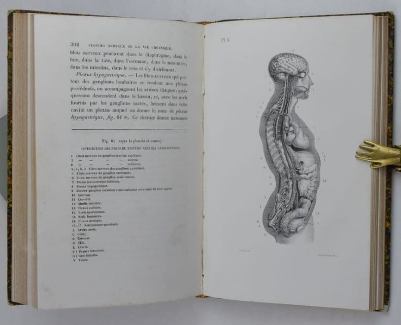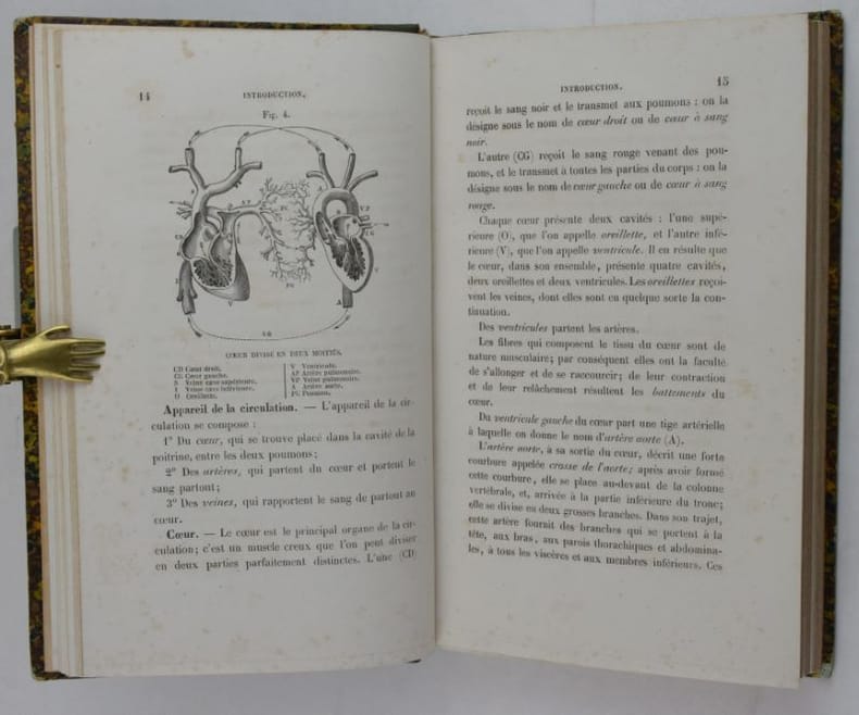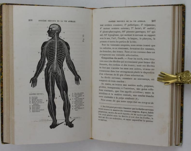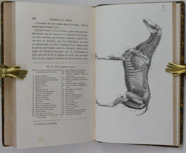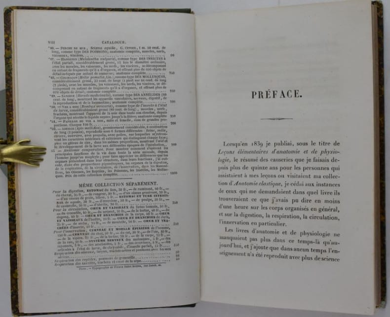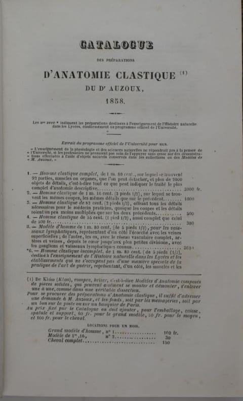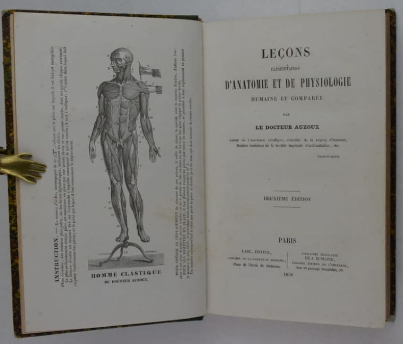 Ouvrage divisé en douze leçons, les deux dernières traitent du cheval. Quatre pages après le titre sont occupées par le "Catalogue des préparations d'anatomie classique du Dr Auzoux, 1858", le frontispice montre son "Homme classique".
