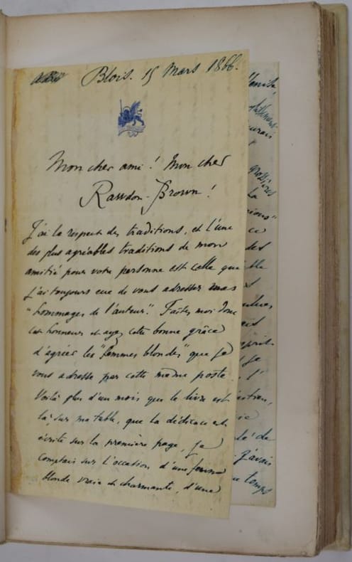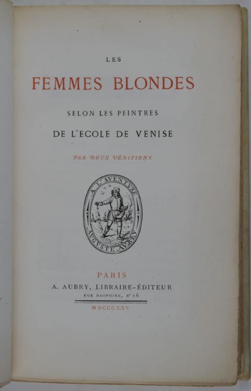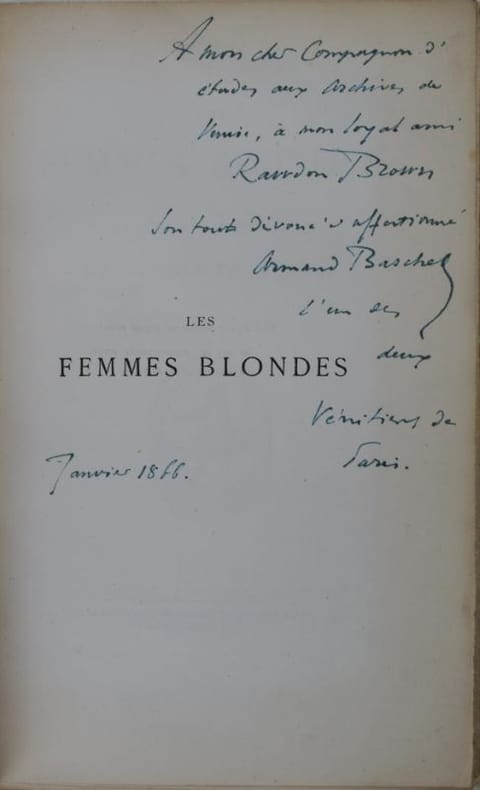 Paris, A. Aubry, 1865. 221 x 143 mm, (2) ff. faux-titre, titre, 326-(2) pp. Reliure parchemin, dos lisse, couvertures et dos conservés, un envoi sur la page de faux-titre et une lettre manuscrite (4 p. in-12) montée sur onglet d'Armand Baschet à l'historien anglais Rawdon Brown. Ex-libris d'Hélène Cauquil sur la garde blanche. Bon exemplaire.