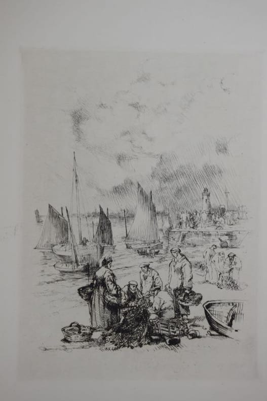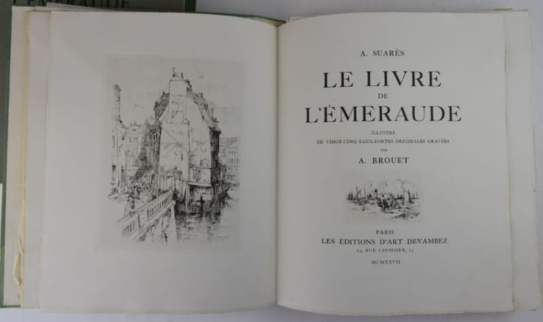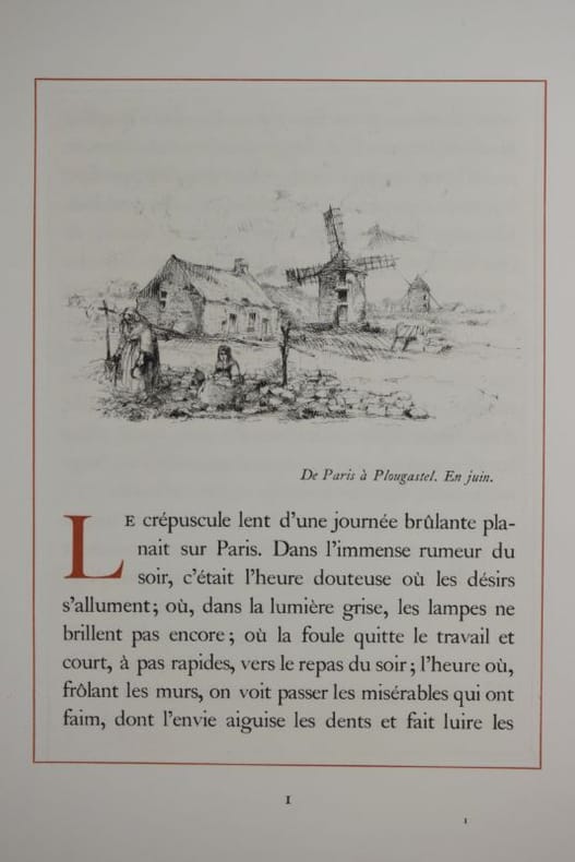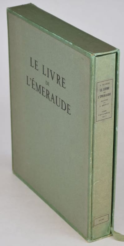 Large 4to. Bound in fine longgrained hmorocco, 4 raised bands, compartments richly gilt with large ornaments, broad back, large corners (Flammarion). Uncut. Top edge gilt. All wrappers withbound. No 34 of 40 ""sur japon imperial"" and with all the plates in 2 states ""contenant l'état définitif des eaux-fortes"". With 25 fine engraved plates in 2 states by Brouet.