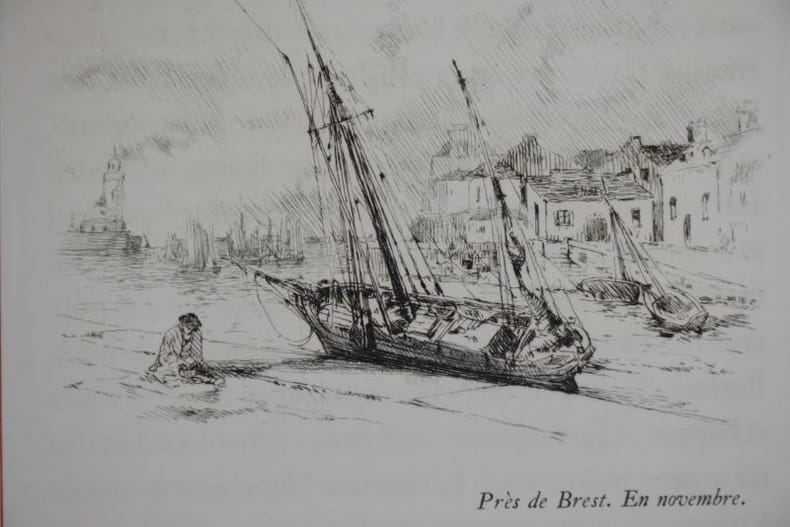 Paris, Les Éditions d'Art Devambez, 1927. In-4 (312 x 249 mm), (3) ff. blancs, (4) ff. : faux-titre, frontispice, titre, titre intermédiaire, VIII-(2)-159-(3) pp., (3) ff. blancs, 25 eaux-fortes originales sous serpentes gravées par A. Brouet dont le frontispice et 10 en pleine page. Joint : bi-feuillet de couvertures et dos. En feuilles sous chemise rempliées, vignette n/b sur première de couverture, chemise cartonnée (rigide) et étui, 1 tache dans la marge d'un feuillet (décharge), dos de la chemise cartonnée insolé, étui frotté, coins ouverts (étui). Tirage à 201 + XX exemplaires numérotés, ici le n° 180, 1 des 140 exemplaires sur vélin d'Arches à la forme filigrané spécialement pour cette édition contenant l'état définitif des eaux-fortes, numérotés de 61 à 200. Bel exemplaire.