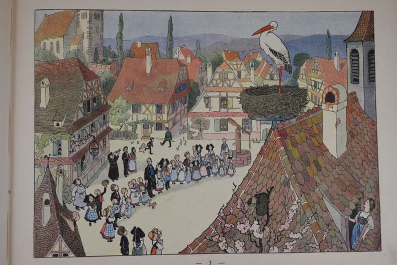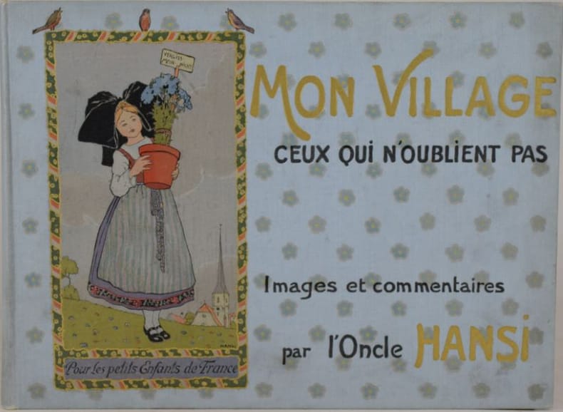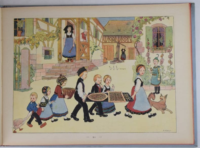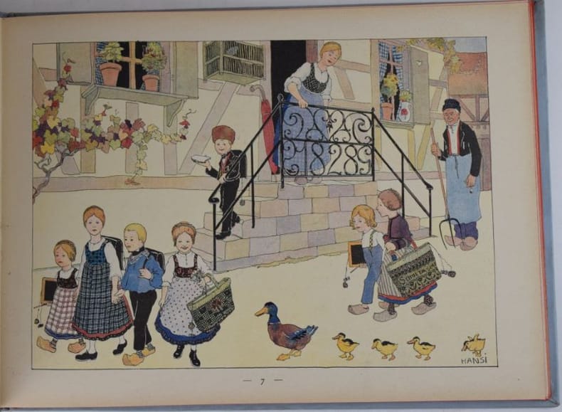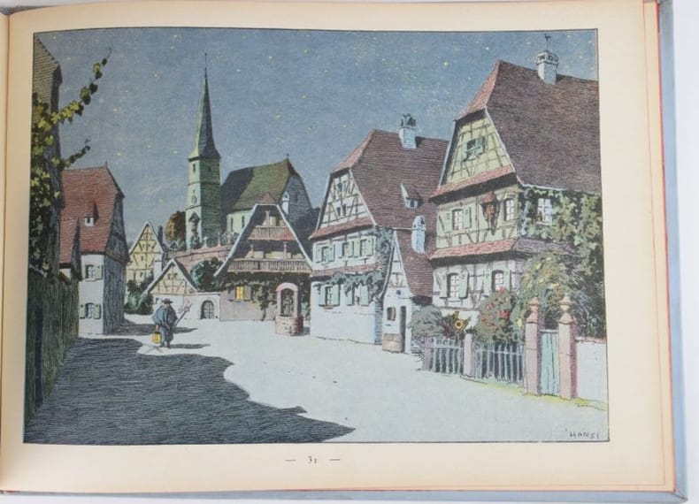 Ravissantes illustrations à toutes pages, voire à pleine page pour 15 d'entre elles. L'Alsace à l'heure où elle était allemande dans un bel album écrit "pour les petits enfants de France". Hansi fut condamné à un an de prison pour s’être moqué des gendarmes et professeurs allemands dans cet album.