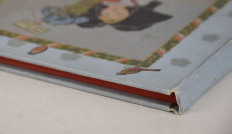 S.L. F. Floury - éditeur, s.d. [1913]. In 4, format oblong à l'italienne (33 x 24,4cm), (4 fx titre page de titre)-31 pp+6 pp n.p. Cartonnage en pleine percaline bleue-gris, décor polychrome de l'éditeur réalisé par ENGEL. Fond décoré d'un semis de fleurs et dans un encadrement coloré une jolie petite alsacienne en costume traditionnel, paysage en arrière plan, tranches rouges.