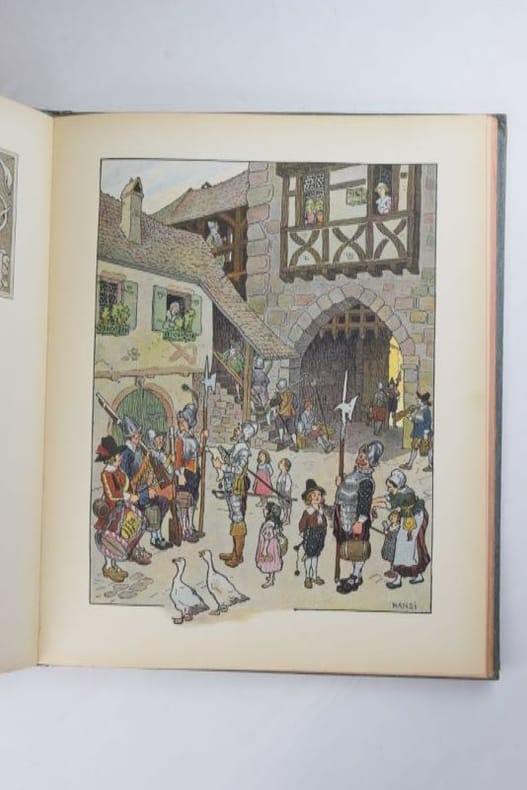 H. Floury, Editeur Paris 1915 In-folio ( 355 X 280 mm ) de 100 pages, cartonnage de percaline bleu, plats illustrés de décors polychromes, toutes tranches brique. Illustrations en couleurs dans et hors-texte à pleine page, par HANSI et HUEN. Usures aux niveau des coiffes, dos légèrement "ombré", gardes intérieures fendues avec première contregarde absente.