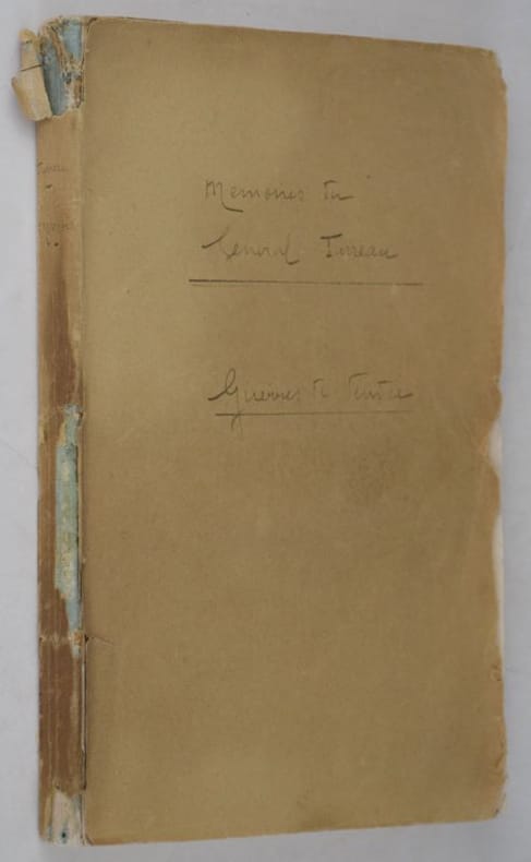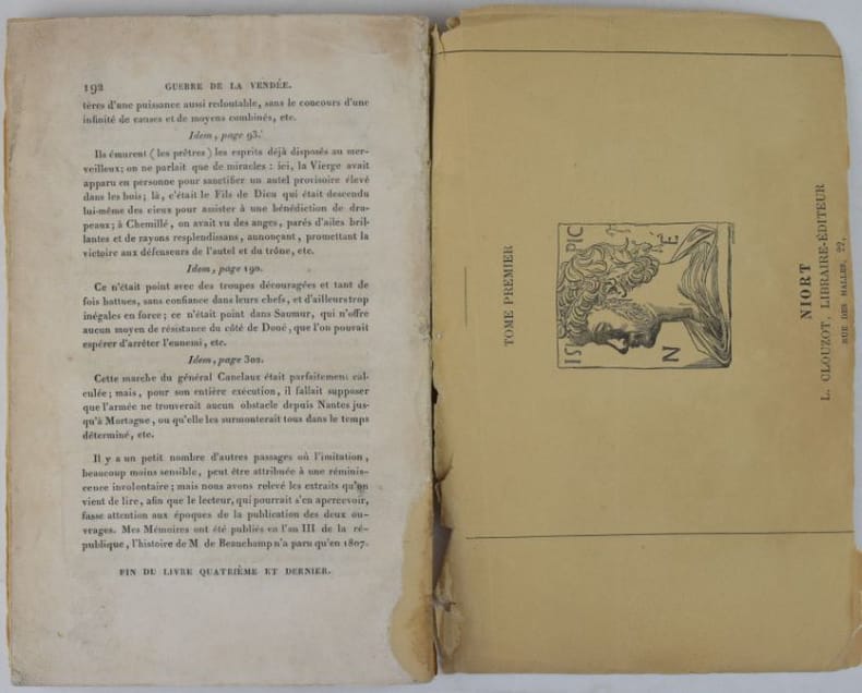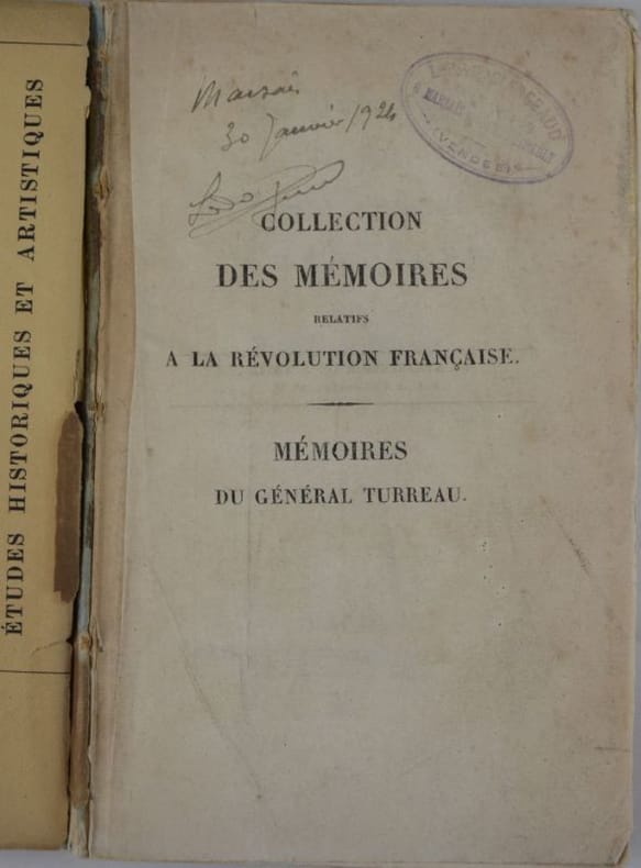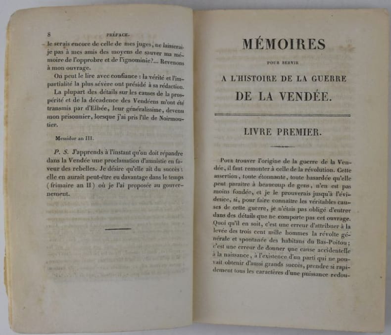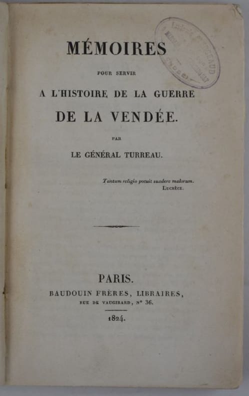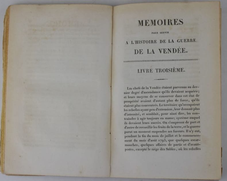 Paris, Baudouin Frères, 1824. 203 x 125 mm, (2) ff. faux titre, titre, VI-192 pp. : Notice sur le Général Tureau, Avant-Propos à l'édition de 1795, Préface, Mémoires pour servir à l'Histoire de la Guerre de la Vendée. Livre I à IV, p. 192 : "Fin du Livre Quatrième et dernier". Broché sous couvertures d'attente, titre manuscrit sur première de couverture, couvertures effrangées, manques de papier aux bords, manques de papier et déchirures au dos, étiquettes blanches contrecollées à la quatrième de couverture, cachet ex-libris sur faux titre et titre, inscription manuscrite ancienne sur faux titre, faux titre empoussiéré, décharges, rousseurs sur tranches. L'édition originale date de 1795.