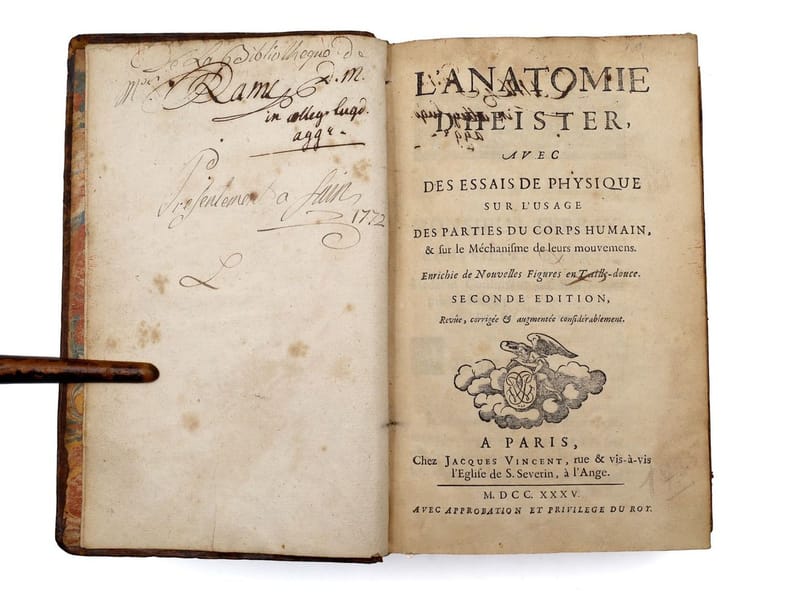 L'anatomie d'Heister avec des essais de physique sur l'usage des parties du corps humain, et sur le mechanisme de leurs mouvemens, Tome Premier de Lorenz Heister chez Vincent, rue S. Severin, à l'Ange en 1753. Le livre est Enrichie de Figures en Taille-douce sur 4 planches dépliantes. Le livre mesure 10x17 cm et pèse 0,400 kg (c) pour 552 pages. Reliure d'époque cartonnée. Le livre est en état d’usage, bon, solide, coiffe basse manquante, signature manuscrite, planches dépliantes avec déchirures et plies (sans manque), rare rousseurs.
