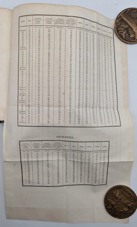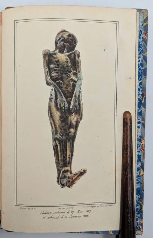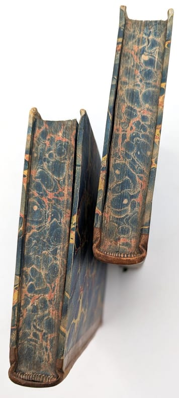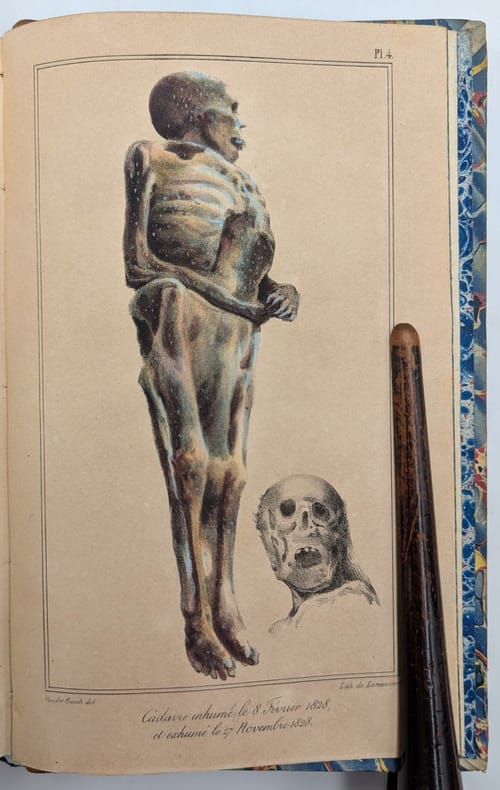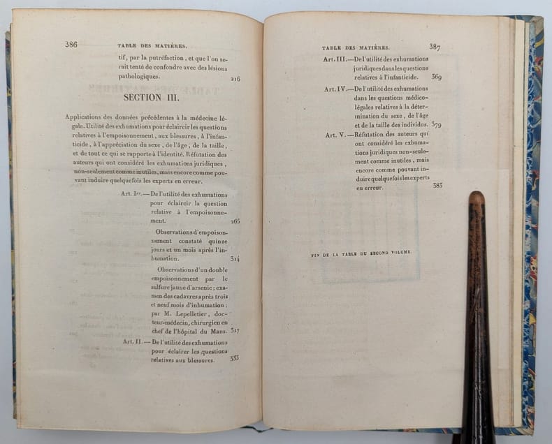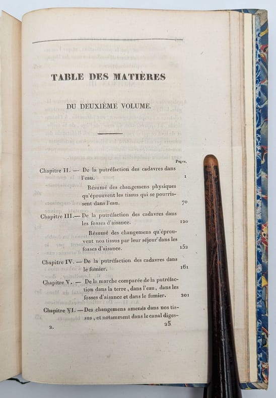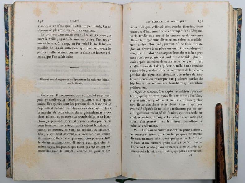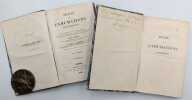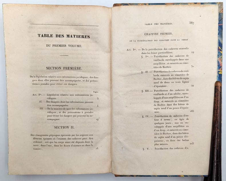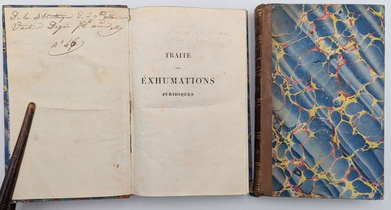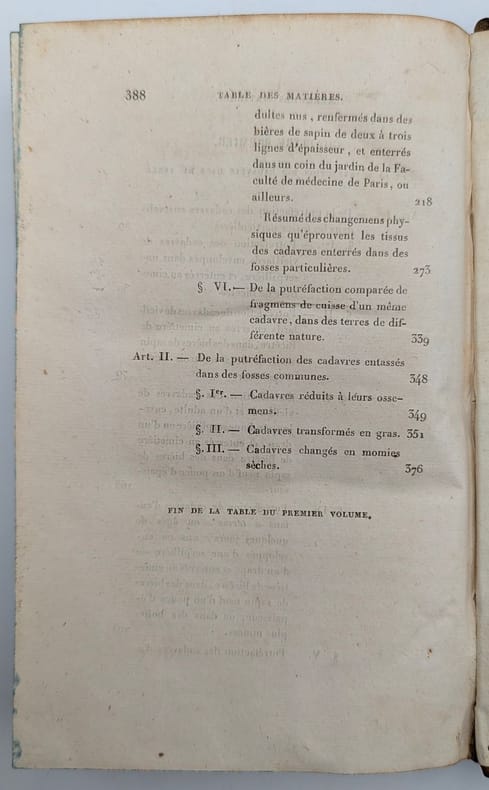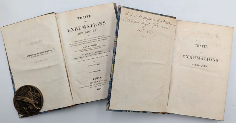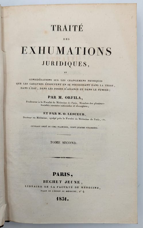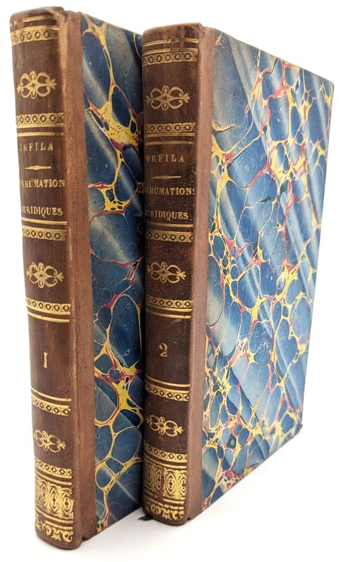 Paris, Béchet Jeune, 1831, in-8, 2 vol, [4]-388 + [4]-387 pp, 5 pl, 1 tabl, Demi-veau brun, dos lisses ornés de fers romantiques, tranches marbrées, Première édition de l'ouvrage le plus rare d'Orfila, qui sera repris dans l'édition la plus complète de son grand traité de médecine légale paru en 1836. L'auteur, qui collabore ici avec son collègue Octave Lesueur (1802-1860), présente une l'étude des modifications putréfactives qui se produisent dans les cadavres lorsqu'ils séjournent dans la terre, dans l'eau, dans les fosses d'aisance et le fumier. L'ouvrage est illustré de cinq belles planches, dont quatre en couleurs, représentant des cadavres exhumés. Avec un tableau statistique dépliant. Ex-libris manuscrit ancien sur une garde blanche. Heirs of Hippocrates N° 1434. Hirsch IV, 439. Couverture rigide