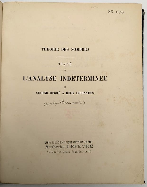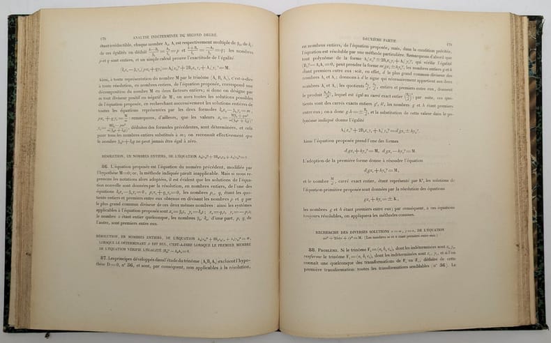 (Paris, Hachette, 1852), in-4, [2]-308 pp, Demi-chagrin vert de l'époque, Très rare édition originale. Les trois premières parties contiennent des méthodes permettant de résoudre des équations indéterminées du second degré de différentes sortes. La quatrième partie, "Recherche sur les racines primitives", comporte une table des racines pour les nombres premiers compris entre 1 et 10000 : elle fut présentée à l'Académie des sciences en 1845 et elle reçut un avis favorable de Poinsot, lors de la séance du 9 février 1846 : "La connaissance des racines primitives peut être utile dans beaucoup de recherches sur la théorie des nombres. On n'avait jusqu'ici que des tables très restreintes, données par Euler et par d'autres géomètres : la nouvelle Table est incomparablement plus étendue, elle contient 4000 racines primitives, et l'auteur vient même de la prolonger jusqu'à 10000" (Poinsot. "Rapport sur un Mémoire de M. Desmarest, contenant une Table de racines primitives pour 4000 nombres premiers". In : Comptes Rendus des Séances de l'Académie des Sciences. Paris, 1846, t. 22, 238-239). Poinsot proposa ainsi de l'inclure dans les Mémoires des savants étrangers de l'Académie (Boucard). Auteur marginal, Eugène Desmarets, né en 1786, étudia à Polytechnique, puis se forma à la pharmacie. Sur le faux-titre : cachet de la Librairie Scientifique ancienne & moderne Ambroise Lefèvre, Paris. Étiquette ex-libris du bibliophile Henri Viellard, cachet de l'Institut catholique de Paris et étiquette en pied du dos. Il manque la page de titre. Jenny Boucard. "Un rapprochement curieux de l'algèbre et de la théorie des nombres" : études sur l'utilisation des congruences en France de 1801 à 1850. Histoire et perspectives sur les mathématiques [math.HO]. Université Pierre et Marie Curie- Paris VI, 2011. Couverture rigide