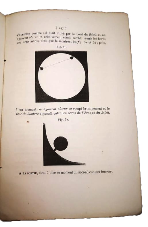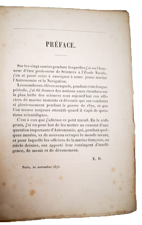 Paris, Gauthier-Villars, 1873, in-12, XI-245-[1]-[6] pp, fig. et tableaux dans le texte, Broché, couvertures de l'éditeur rapportées, titre manuscrit au dos, "Considérés du point de vue de la détermination de la distance du soleil à la terre. Passage de 1874. Notions historiques sur les passages de 1761 et 1769." Envoi de l'auteur, examinateur hydrographe de la Marine. Exemplaire en bon état, peu commun. Anciens numéros et cachets ex-libris de l'Institut catholique de Paris. Couverture rigide