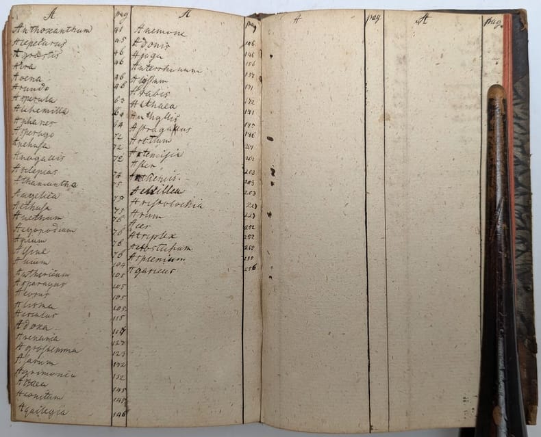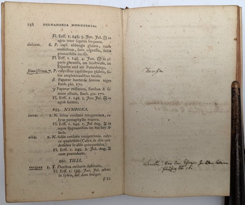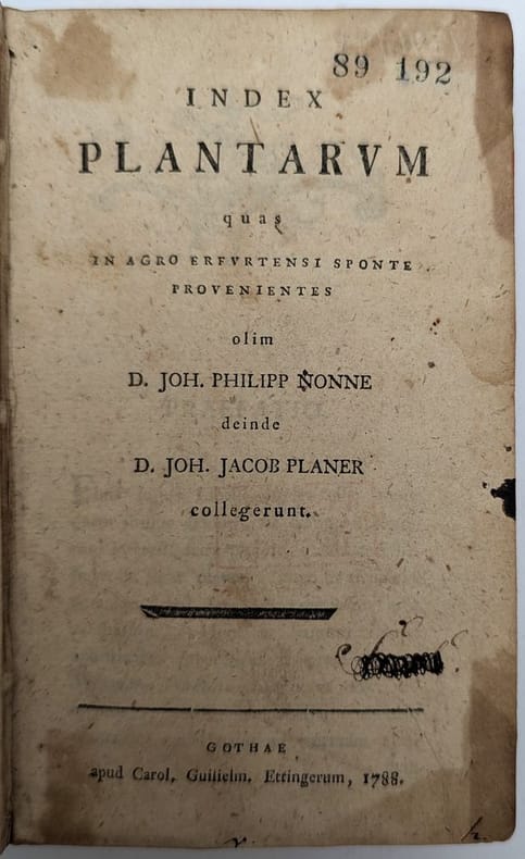 Gothae, Apud Carol. Guilielm. Ettingerum, 1788, in-8, 283-[1] feuillets interfoliés de feuillets blancs suivis de 24 pp. manuscrites, Demi-basane brune de l'époque, dos à nerfs fleuronné, Première édition de cet index de plantes, réalisé par le médecin allemand Johann Philipp (1729 - 1772) en collaboration avec le botaniste et mycologue Johann Jacob Planer (1743-1789), dans la capitale de thuringe la ville d'Erfut en Allemagne. L'ouvrage se termine par 24 pages manuscrites à l'encre noire. Reliure usée. Anciens cachets et numéros de l'Institut catholique de Paris. Couverture rigide