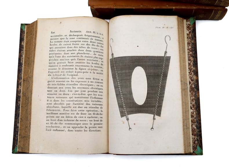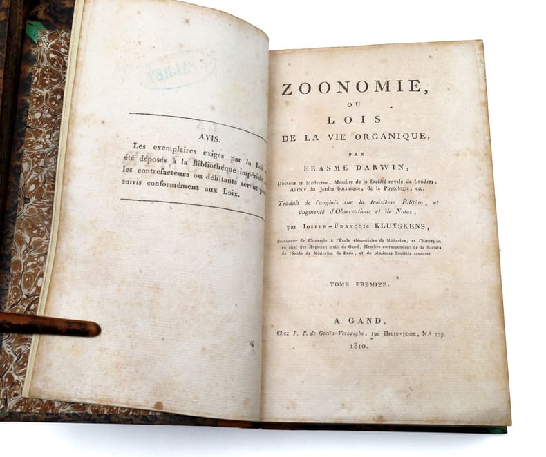 Gand, P. F. de Goesin-Verhaeghe, 1810-1811, in-8, 4 vol. : [6]-20 pp, [1] ff, pp. 19 à 23-[1], 614 pp, 3 pl. ? [4]-659-[1] pp, 4 pl. ? XIV-586 pp, 3 pl. ? [2]-570 pp, 1 pl. dépl, Demi-veau glacé postérieur, dos lisses et fleuronnés, pièces de titre et de tomaison havane, tranches marbrées, Première édition française de cet ouvrage majeur par le grand père de Charles Darwin, Erasmus Darwin (1731-1802). Cette somme, où se mêlent médecine, biologie et philosophie naturelle, avec certaines intuitions évolutionnistes, a été publiée à l'origine en 1794-1796 (Zoonomia; or the laws of organic life. 2 vols. London, J. Johnson). Le texte est illustré de onze planches, dont cinq en couleurs, qui représentent des expériences de persistence rétinienne et des inventions - ou appareil améliorés - de l'auteur : une machine thérapeutique à décharge électrostatique, consistant en une planchette et deux tubes de verre; un fauteuil orthopédique; une boîte à brosse circulaire pour pulvérisation de quinquina et de céruse dans le traitement de la phtisie; et un "lit de repos mobile à roues", envisagé pour faire tourner les malades afin de les endormir. Erasmus Darwin, inventeur, poète et pionnier en médecine, s'est préoccupé de philosophie naturelle et s'est intéressé aux recherches et inventions contemporaines. Il conçut un moulin à vent horizontal, une charrue améliorée, une pompe rotative ou encore une machine parlante. Il travailla aussi sur la turbine à vapeur, les toilettes, les élévateurs de canal et les télescopes. Il explora encore la formation des nuages, décrivit la photosynthèse et défendit un traitement humain des maladies mentales (Heirs of Hippocrates n° 998). On le considère comme un théoricien précoce de l'évolution : il postulait que la reproduction sexuelle est au coeur des changements et des progrès de l'évolution, tant chez les humains que chez les plantes. Son célèbre descendant déclara toutefois que la théorie d'Erasmus n'avait pas eu d'effet sur L'Origine des espèces (Laniel-Musitelli) : toutefois, Charles Darwin reconnaissait l'intérêt des travaux de son aïeul, en admettant notamment qu'il était "curieux de voir combien le docteur Erasme Darwin, [son] grand-père, dans sa Zoonomia (...), a devancé Lamarck dans ses idées et ses erreurs"*. Garrison & Morton n° 105 pour l'édition originale; Heirs of Hippocrates n° 999 pour la 2e édition anglaise. Sophie Laniel-Musitelli, "Erasmus Darwin : naissance du transformisme dans le texte poétique". In Bulletin d'histoire et d'épistémologie des sciences de la vie, 2011/1 (Volume 18), p. 25-40. Cachet ex-libris du psychiatre J[ules] Falret. Charnières fendillées et fragiles, manque en tête d'un dos. Bon état intérieur. * Charles Darwin, L'origine des espèces au moyen de la sélection naturelle (...) traduit sur la 6e édition anglaise, par Ed. Barbier. Paris, Reinwald, 1876, p. X. Couverture rigide