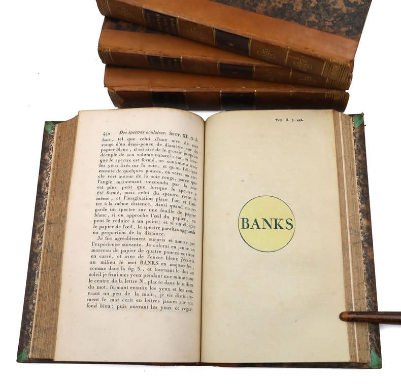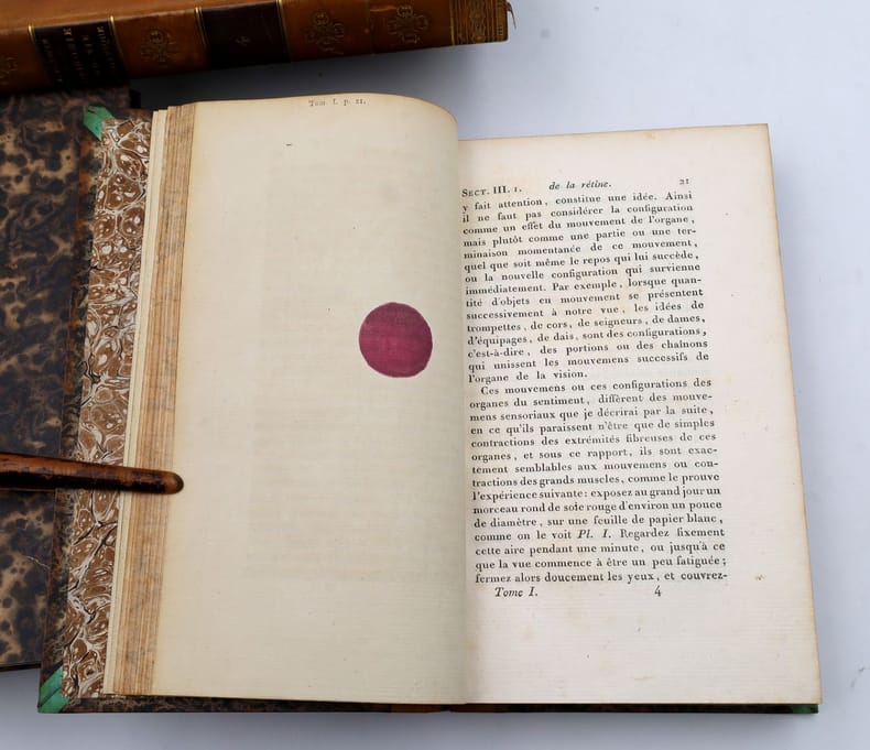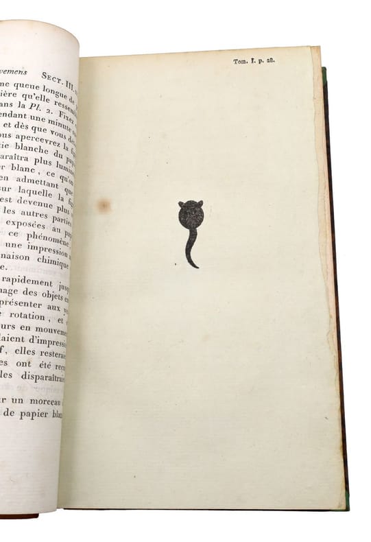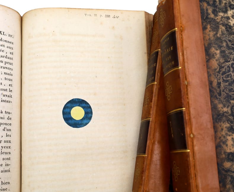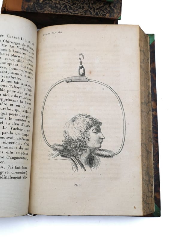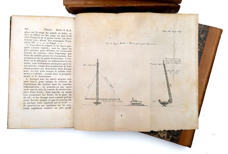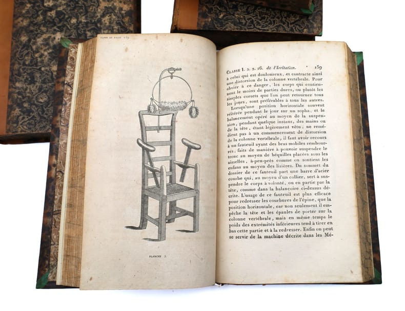 Première édition en français, traduite de l'anglais par Joseph-François Kluyskens et due à Erasmus Darwin (E.O. : 1795 et 1799). Le présent ouvrage est considéré comme son uvre principale pour ce qui touche aux sciences naturelles et à la médecine. Erasmus Darwin (1731-1802) est un poète, médecin, botaniste et inventeur britannique. 70 ans avant les travaux de son célèbre petit-fils et face au créationnisme alors dominant, il amorce de façon significative les réflexions sur l'origine de la vie et son évolution. Médecin, il exerce son art avec un grand succès à Lichfield. On a de lui un poème célèbre, le Jardin botanique (1781), divisé en deux parties, intitulées : l'Économie de la végétation et les Amours des plantes, et un ouvrage fort original, la Zoonomie ou Lois de la vie organique (1794) : il y classe les maladies de l'homme d'après une méthode analogue à celle adoptée par Carl von Linné (1707-1778, naturaliste suédois) pour les plantes, et les explique toutes par l'excitabilité, comme Thomas Brown (1785-1862, naturaliste et un malacologiste britannique). Dans cet ouvrage, de même que dans le poème posthume The Temple of Nature, il expose des idées évolutionnistes. Sa curiosité le conduit à s'interroger sur les raisons de la présence de coquillages fossilisés présents au fond des mines ainsi que sur le développement des bactéries qu'il observe au microscope. Il mène également des recherches sur les nuages. Dans ses travaux et sa réflexion, il en vient à remettre en cause la doctrine alors dominante du créationnisme. Il fait jouer un rôle à la sélection sexuelle dans l'évolution des espèces, idée que son petit-fils soutiendra lui aussi et qui intitulera Zoonomia le premier manuscrit de l'Origine des espèces. Également inventeur dans divers domaines, Erasmus Darwin laisse cependant d'autres s'attribuer certaines de ses inventions, craignant pour sa réputation en tant que médecin. On lui attribue ainsi :le moulin à vent horizontal de Josiah Wedgwood (grand-père d'Emma Wedgwood, épouse de Charles Darwin) ; un type de chariot qui ne se renverse pas (1766) ; une machine parlante (1771) ; l'ascenseur à caisson du canal à charbon du Somersetshire ; un dispositif géométrique de liaison dans la direction d'un véhicule (1758), préfigurant la géométrie directionnelle d'Ackermann ; un puits artésien ainsi que divers appareils de météorologie. Le traducteur, Joseph-François Kluyskens, décrit cette oeuvre de Darwin comme telle: Faire connaître les lois qui gouvernent tous les corps organisés ; réduire toutes ces lois qui ont rapport à la vie organique en classes, ordres, genres et espèces, et les faire servir enfin à l'explication des causes des maladies ; tel fut le but que se proposa le Docteur Darwin lorsqu'il composa la Zoonomie, ouvrage sublime qui lui a coûté plus de vingt années de travail, et les plus profondes méditations (Préface du traducteur, vol. 1). Louvrage est illustré de 11 planches, dont plusieurs rehaussées à laquarelle, représentant la rétine et le spectre oculaire. A noter l'impressionnante gravure du fauteuil pour corriger la distorsion de la colonne vertébrale. Rare exemplaire dont ne dénombre que 2 exemplaires passés en vente ces 50 dernières années. Bel exemplaire conservé dans sa reliure dépoque. 4 vol. 8vo (212 x 138 mm.) of : I. [3] ff. (faux-title, title, epigraph); 20 pp. (preface by the translator); [1] f. (title of the first part); 23 pp. (resumption of pagination at 19, preface by the author); [1] pp. (table) ; 614 pp. ; [1] p. (errata); 3 watercolor plates; II. [2] ff. (title, table) ; 659 pp. ; [2] pp. (errata, notice to the binder); 4 plates (3 watercolors, 1 engraved); III. XIV pp. (title, title of the second part, preface by the author) ; 586 pp. ; 3 engraved plates ; IV. [1] f. (title) ; 570 pp. (including table) ; 1 engraved folding plate. A total of 11 plates (including 1 folding and 6 in watercolor). (Body of the book very fresh). Contemporary half-basane, boards covered with marbled paper, spines decorated with smooth edges, title in black morocco, edges speckled. (A few small freckles). First edition in French, translated from English by Joseph-François Kluyskens and due to Erasmus Darwin (E.O.: 1795 and 1799). The present work is considered to be his main work on natural sciences and medicine. Erasmus Darwin (1731-1802) was a British poet, physician, botanist and inventor. Seventy years before the work of his famous grandson and in the face of the then dominant creationism, he significantly initiated reflections on the origin of life and its evolution. As a physician, he practiced his art with great success in Lichfield. He wrote a famous poem, the "Jardin botanique" (1781), divided into two parts, entitled "l'Économie de la végétation" and "Amours des plantes", and a very original work, the "Zoonomie ou Lois de la vie organique" (1794): he classifies the diseases of man according to a method similar to the one adopted by Carl von Linné (1707-1778, Swedish naturalist) for plants, and explains them all by excitability, like Thomas Brown (1785-1862, British naturalist and malacologist). In this work, as well as in the posthumous poem "The Temple of Nature", he exposes evolutionary ideas. His curiosity led him to question the reasons for the presence of fossilized shells at the bottom of mines as well as the development of bacteria, which he observed under a microscope. He also conducted research on clouds. In his work and his reflection, he came to question the then dominant doctrine of creationism. He gave a role to sexual selection in the evolution of species, an idea that his grandson would also support and even entitled "Zoonomia" the first manuscript of the Origin of Species. Also an inventor in various fields, Erasmus Darwin allowed others to take credit for some of his inventions, fearing for his reputation as a doctor. He is credited with: Jos