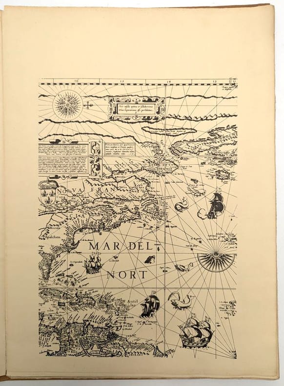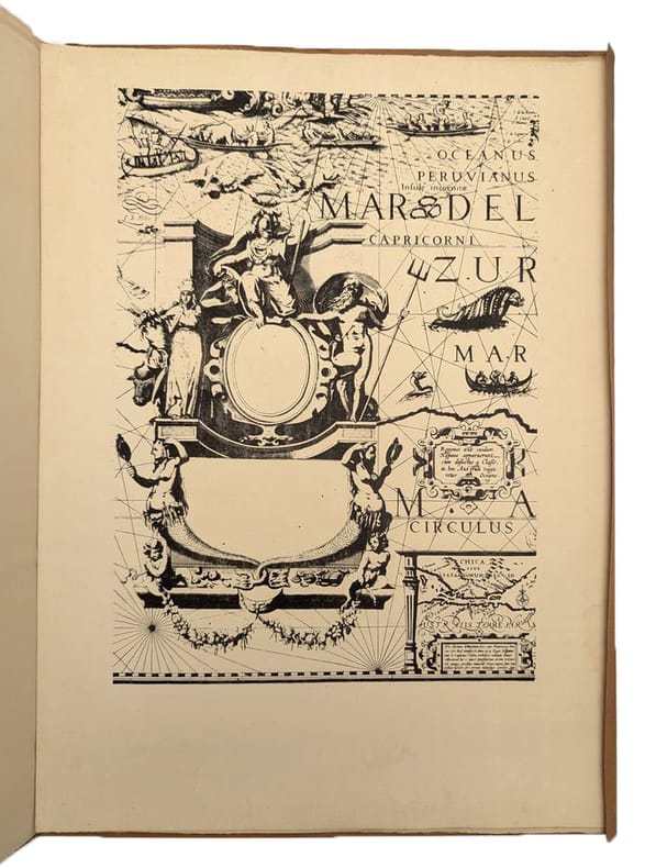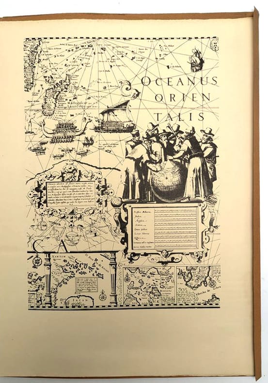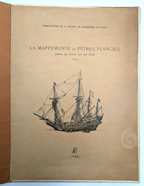 Publications de la Société de Géographie de Hanoï, 1944, in-folio, 1 page de titre et 12 ff, En feuilles sous couverture ocre de l'éditeur, Première édition des 12 planches en facsimilé reproduisant la mappemonde ou planisphère gravé de 1592 de Petrus Plancius (1552-1622), découvert en 1903, au Colegio del Corpus Christi de Valence*. Fac-similé de la carte conservée à la BnF sous la cote GE DD 2974 : "Nova Et Exacta Terrarum Orbis Tabula Geographica Ac Hydrographica / Josua Van den Ende fecit". Exemplaire sans le volume de texte publié en 1941 (vol. in-4 de VIII-51 pp.), cachet ex-libris "JNR" à la première de couverture. Bon état des planches, une auréole pâle à la page de titre. *Voir Roger Hervé, "M. Destombes, Cartes hollandaises. La cartographie de la Compagnie des Indes orientales, 1593-1743. La mappemonde de Pétrus Plancius gravée par Josua Van den Ende, 1604, d'après l'unique exemplaire de la Bibliothèque Nationale de Paris." [compte-rendu] : Revue d'histoire des sciences Année 1949 2-4 pp. 374-378. Couverture rigide