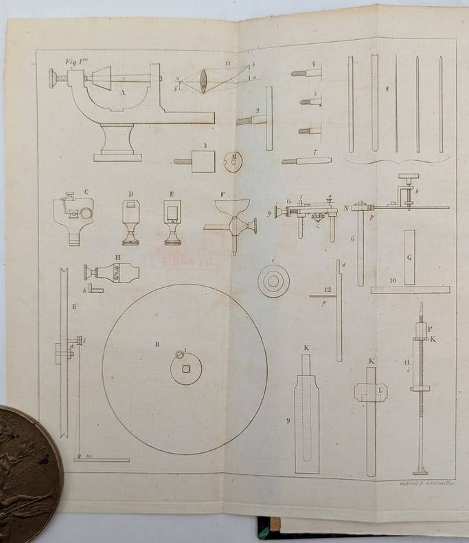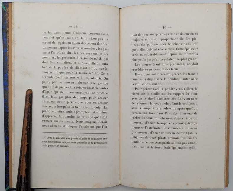 Paris, Chez Dentu Librairie Palais Royal, 1843, in-8, VIII-54-[1] pp. 1 pl. dép, Demi-basane bleue postérieure, dos fileté en doré, Première édition, très peu commune, avec une planche dépliante représentant un tour, de ce mémoire qui expose en dix leçons la manière de dégrossir des pierres, de les percer, de faire des pierres plates, les repos, les tuiles, de préparer la poudre de diamant et en leçon ultime une explication des lentilles employées en optique. Exemplaire avec tampons anciens de l'Institut catholique de Paris. Très bon état. Couverture rigide