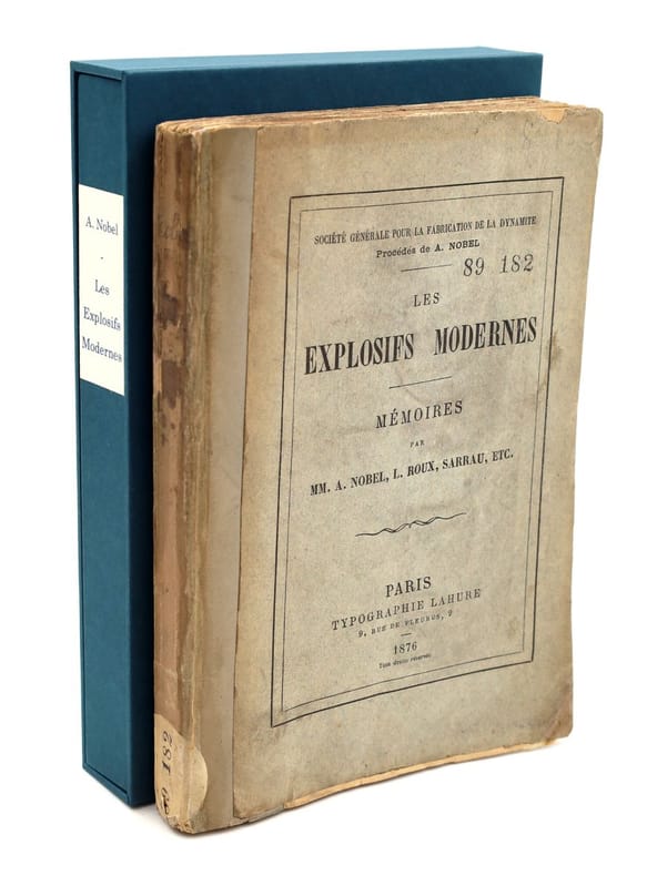 Paris, Typographie Lahure, 1876, in-12, [4]-2-235-[4] pp, Broché, couverture imprimée de l'éditeur, dos factice. Chemise et étui modernes, Très rare édition originale de cette publication destinée à tenir le public "au courant des progrès réalisés dans l'art des substances explosives". L'ouvrage a été publié par la Société générale pour la fabrication de la dynamite, filiale française des entreprises chargées de suivre les procédés brevetés par Alfred Nobel (1833-1896). Il se constitue d'articles de Nobel lui-même, de Louis Pierre Roux (1823-1904), d'Émile Sarrau (1837-1904) et de Henri Violette (1809-1880). Dans les années 1860, Alfred Nobel invente la dynamite et son détonateur, révolutionnant l'industrie et la construction. Pour répondre à la demande croissante et pressante, il fonde d'abord une société par actions en Suède (Nitroglycerin Aktiebolaget AB, 1864), puis crée la première holding internationale, la Nobel Dynamite Trust Company, devenant ainsi un entrepreneur mondial majeur. En France, il s'associe dès 1868 à Paul Barbe : ensemble, ils créent en 1875 la Société générale pour la fabrication de la dynamite, qui exploite ses brevets et installe une grande usine à Paulilles. Un "Latin Trust" regroupe ensuite ses usines françaises, espagnoles, italiennes, suisses, portugaises, ainsi que des filiales au Venezuela et au Transvaal. Après la mort d'Alfred Nobel, ses parts dans ces entreprises ont été liquidées, fournissant le financement initial des fameux prix Nobel. Dos factice, consolidé. Rares surcharges au crayon. Bon exemplaire. Cachets de l'Institut catholique de Paris et étiquette en pied du dos. Couverture rigide