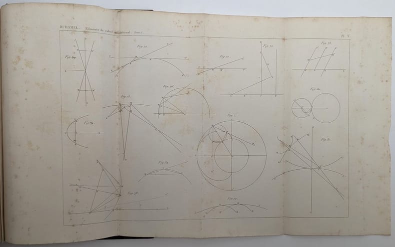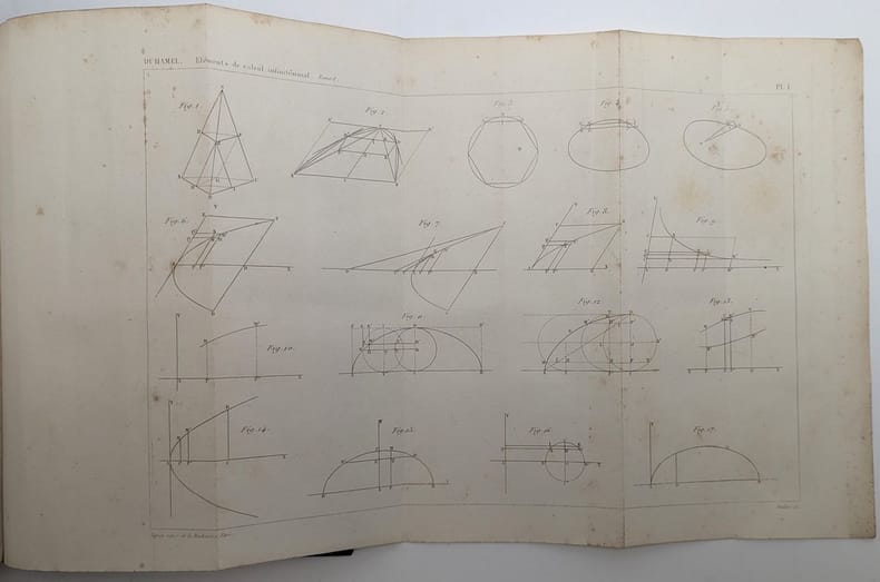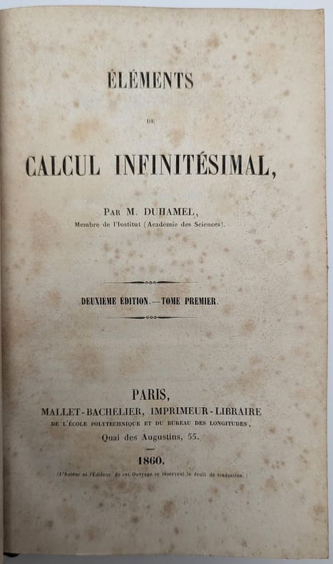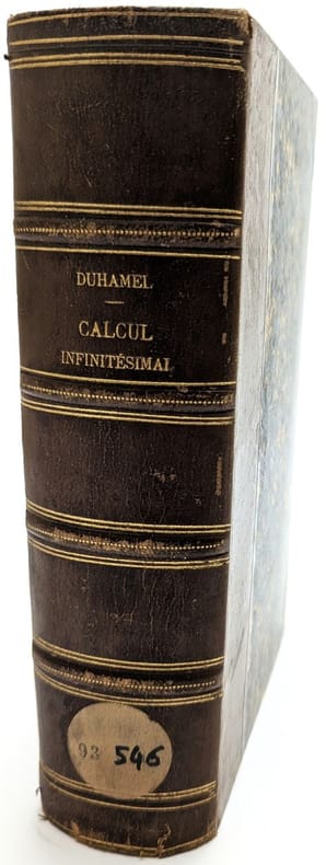 Paris, Mallet-Bachelier, 1860-1861, in-8, 2 vol. , T.I: XX, 473, (1bl)pp, 6pl.; T.II: XV, (1bl), 490pp, 1pl, demi-chagrin bronze, dos à nerfs ornés de compartiments dorés. (Rel. de l'ép.), Deuxième édition de cet ouvrage qui fut publié pour la première fois en 1856. Des quantités considérées comme limites; calcul des dérivées et des différentielles des fonctions; des limites de sommes, calculs inverses du calcul différentiel; intégration des équations différentielles. Jean Marie Constant Duhamel (1797-1872) fit partie de la famille des grands mathématiciens de son époque : Poinsot, Ampère et Fourier. Il fut élu membre de l'Académie des sciences en 1840; il enseigna à l'Ecole polytechnique et à la Sorbonne, chaire d'analyse. (cf. DBF, XII, 16). Rousseurs. Reliure de prix : Lycée St-Louis Couverture rigide